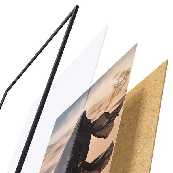 Plakatą sudaro rėmas, pleksiklas, atspausdintas vaizdas ir medžio drožlių plokštės pagrindas. Plakatą galima iš karto pakabinti ant sienos dėl kitoje pusėje esančių laikiklių.