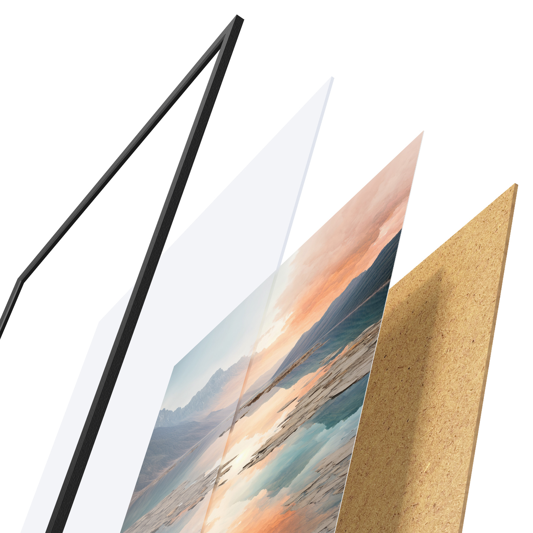 Plakatą sudaro rėmas, pleksiklas, atspausdintas vaizdas ir medžio drožlių plokštės pagrindas. Plakatą galima iš karto pakabinti ant sienos dėl kitoje pusėje esančių laikiklių.