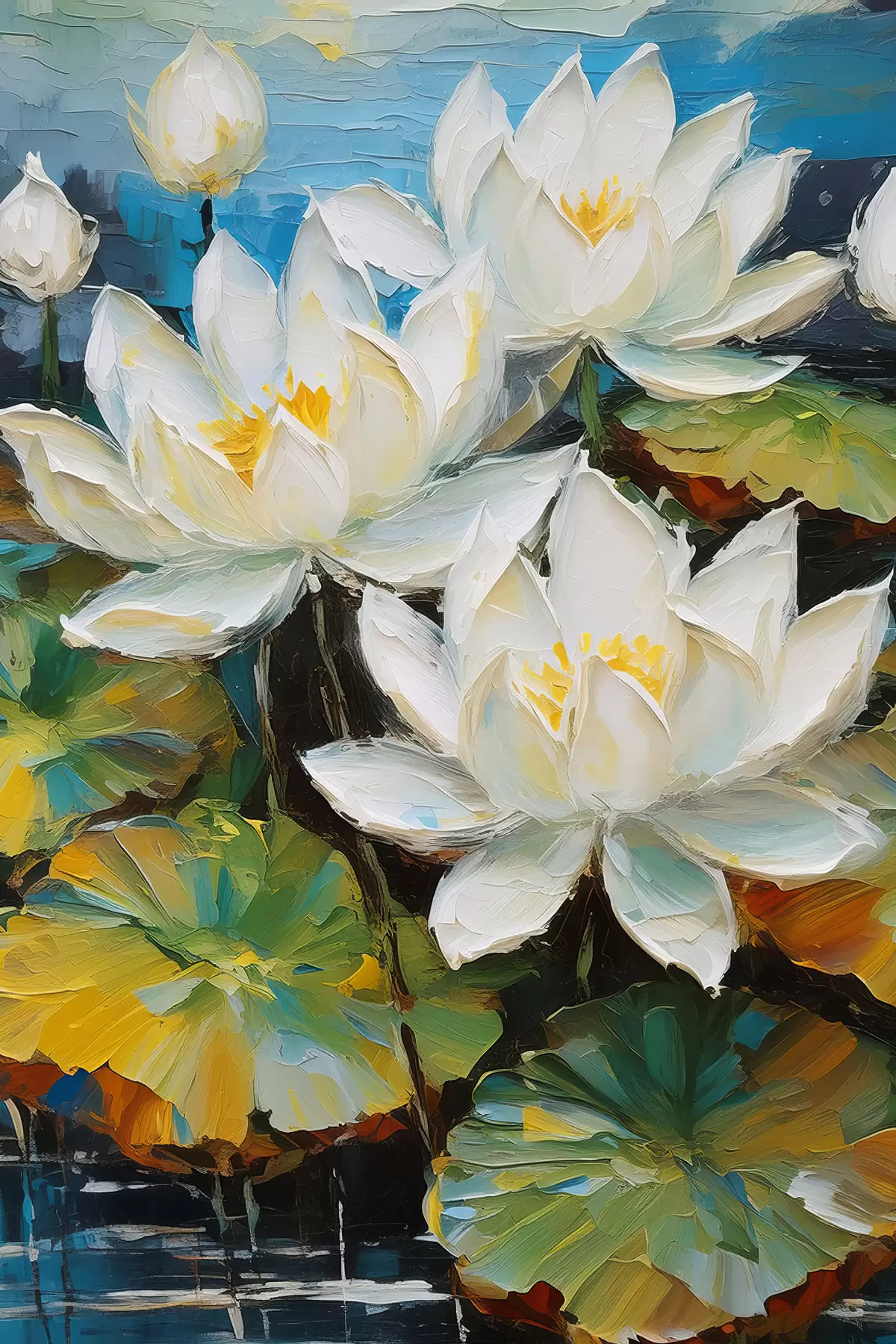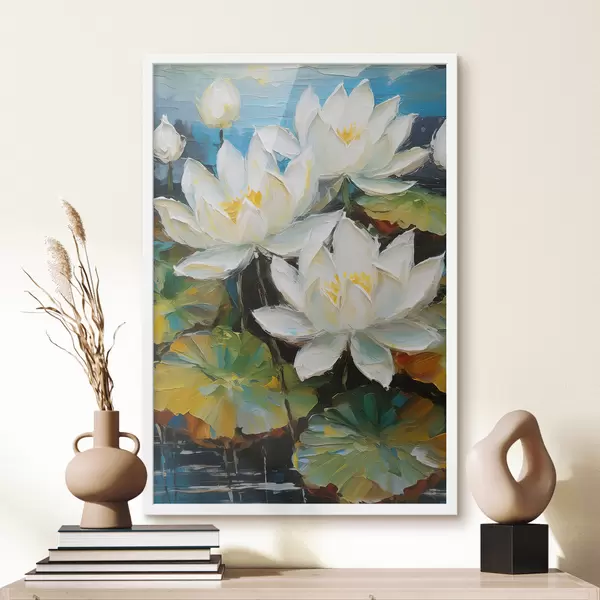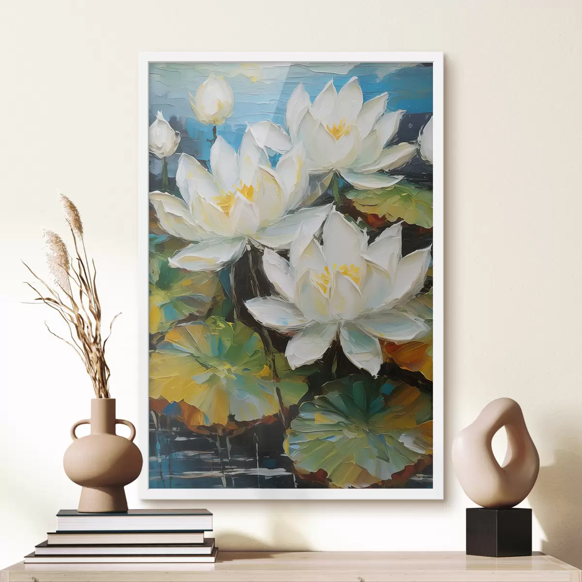 Plakatas balti lotoso žiedai ant vandens, didelės gėlės, aliejiniai dažai f38604