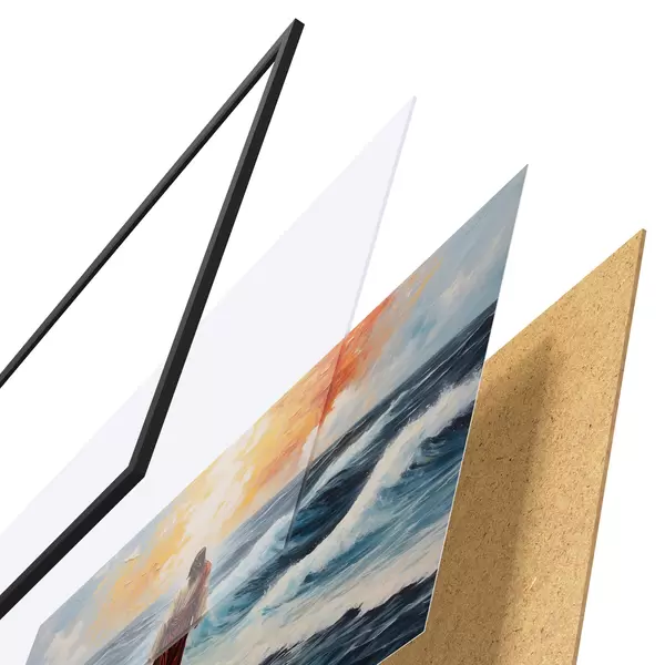 Plakatą sudaro rėmas, pleksiklas, atspausdintas vaizdas ir medžio drožlių plokštės pagrindas. Plakatą galima iš karto pakabinti ant sienos dėl kitoje pusėje esančių laikiklių.