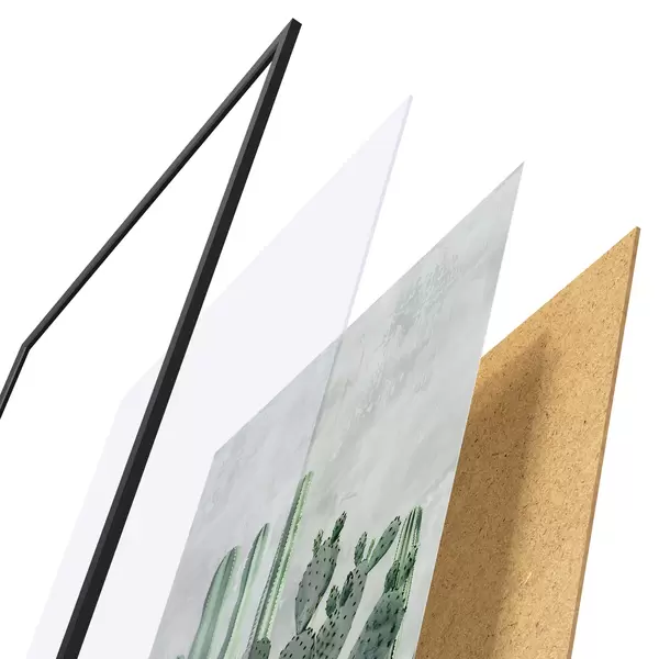 Plakatą sudaro rėmas, pleksiklas, atspausdintas vaizdas ir medžio drožlių plokštės pagrindas. Plakatą galima iš karto pakabinti ant sienos dėl kitoje pusėje esančių laikiklių.