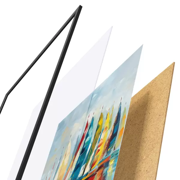 Plakatą sudaro rėmas, pleksiklas, atspausdintas vaizdas ir medžio drožlių plokštės pagrindas. Plakatą galima iš karto pakabinti ant sienos dėl kitoje pusėje esančių laikiklių.