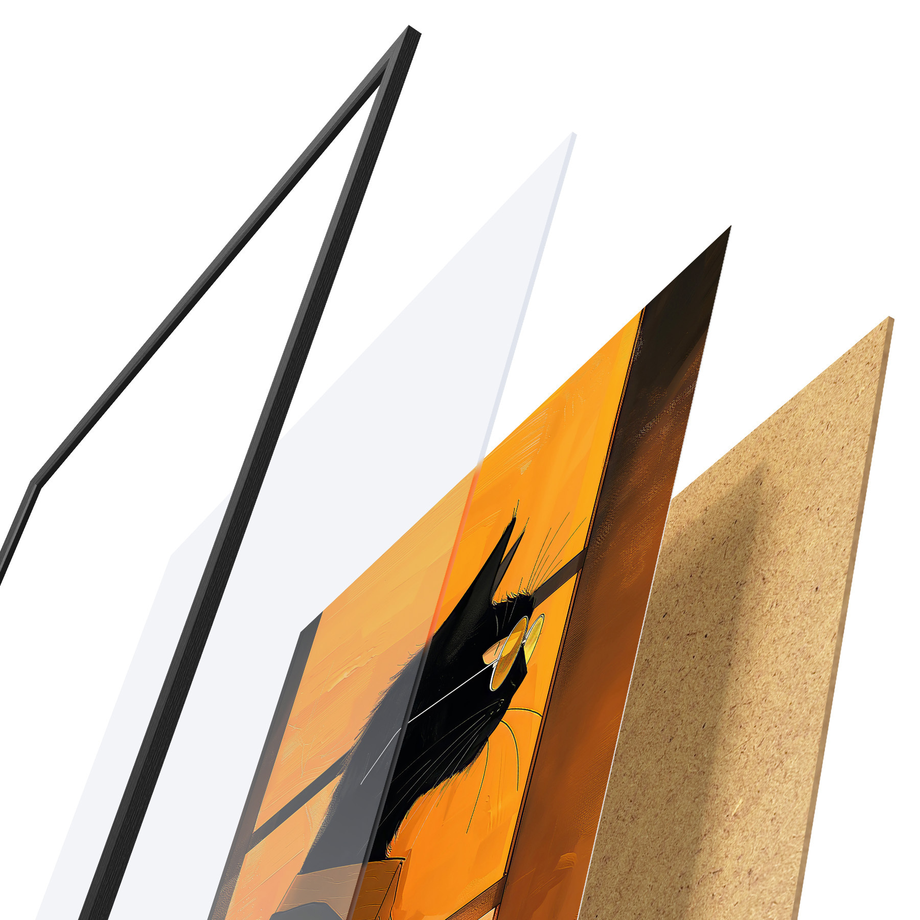 Plakatą sudaro rėmas, pleksiklas, atspausdintas vaizdas ir medžio drožlių plokštės pagrindas. Plakatą galima iš karto pakabinti ant sienos dėl kitoje pusėje esančių laikiklių.