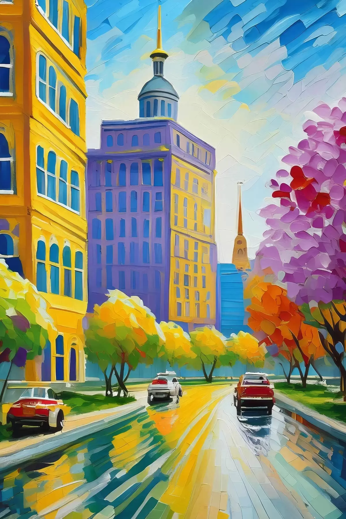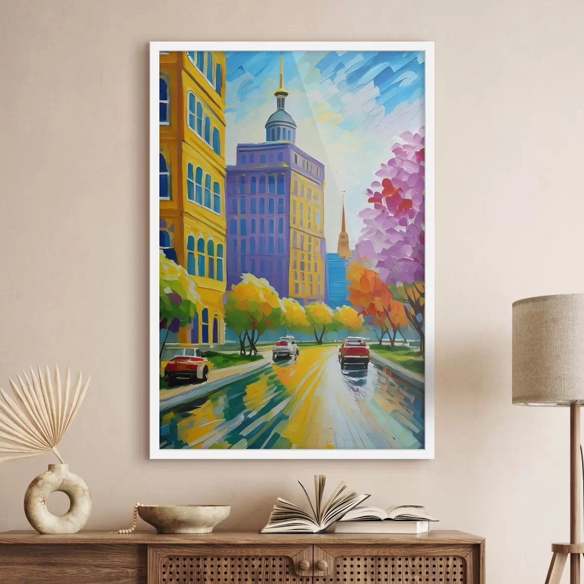 Plakatas Miesto gatvės su automobiliais ir medžiais vaizdas f38657