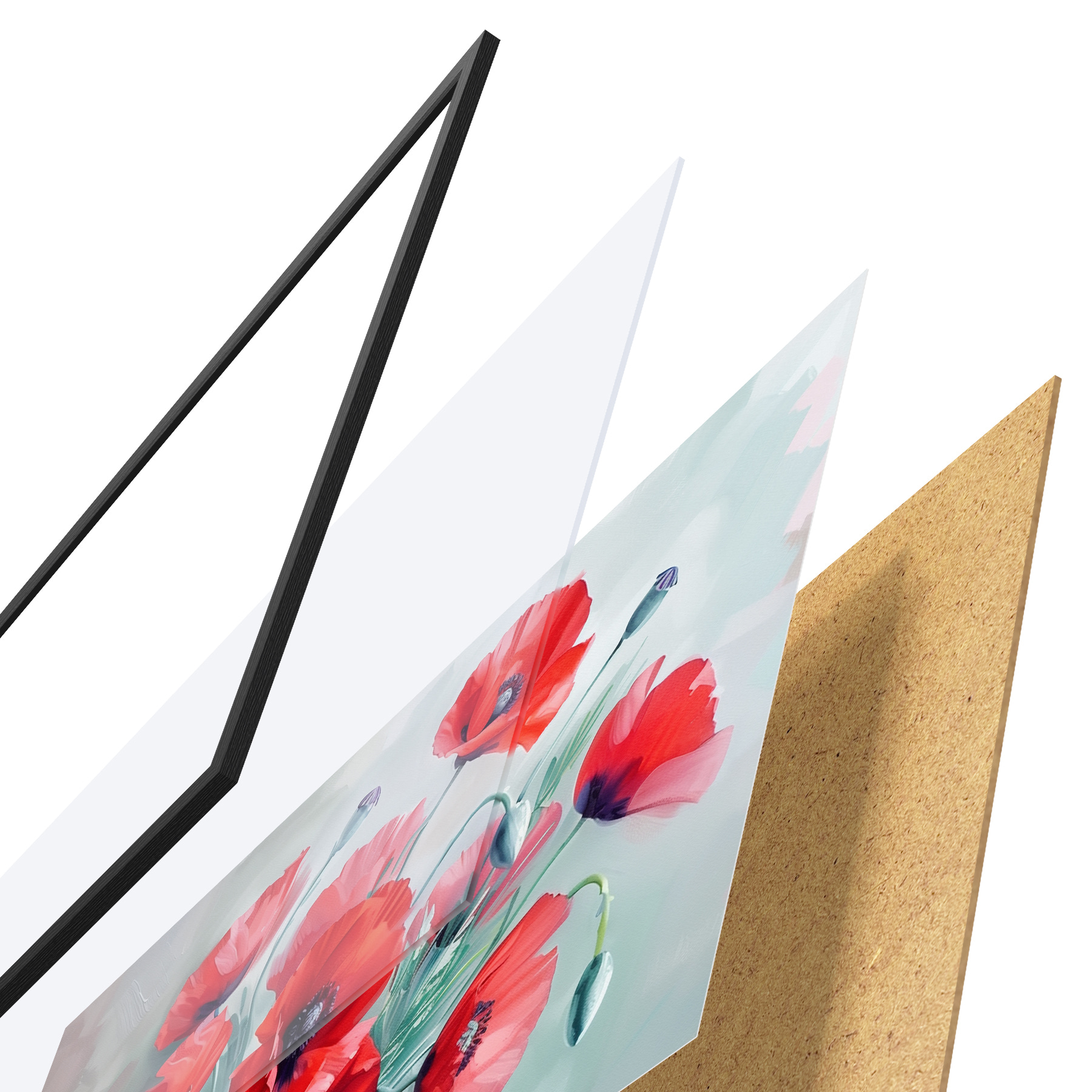 Plakatą sudaro rėmas, pleksiklas, atspausdintas vaizdas ir medžio drožlių plokštės pagrindas. Plakatą galima iš karto pakabinti ant sienos dėl kitoje pusėje esančių laikiklių.