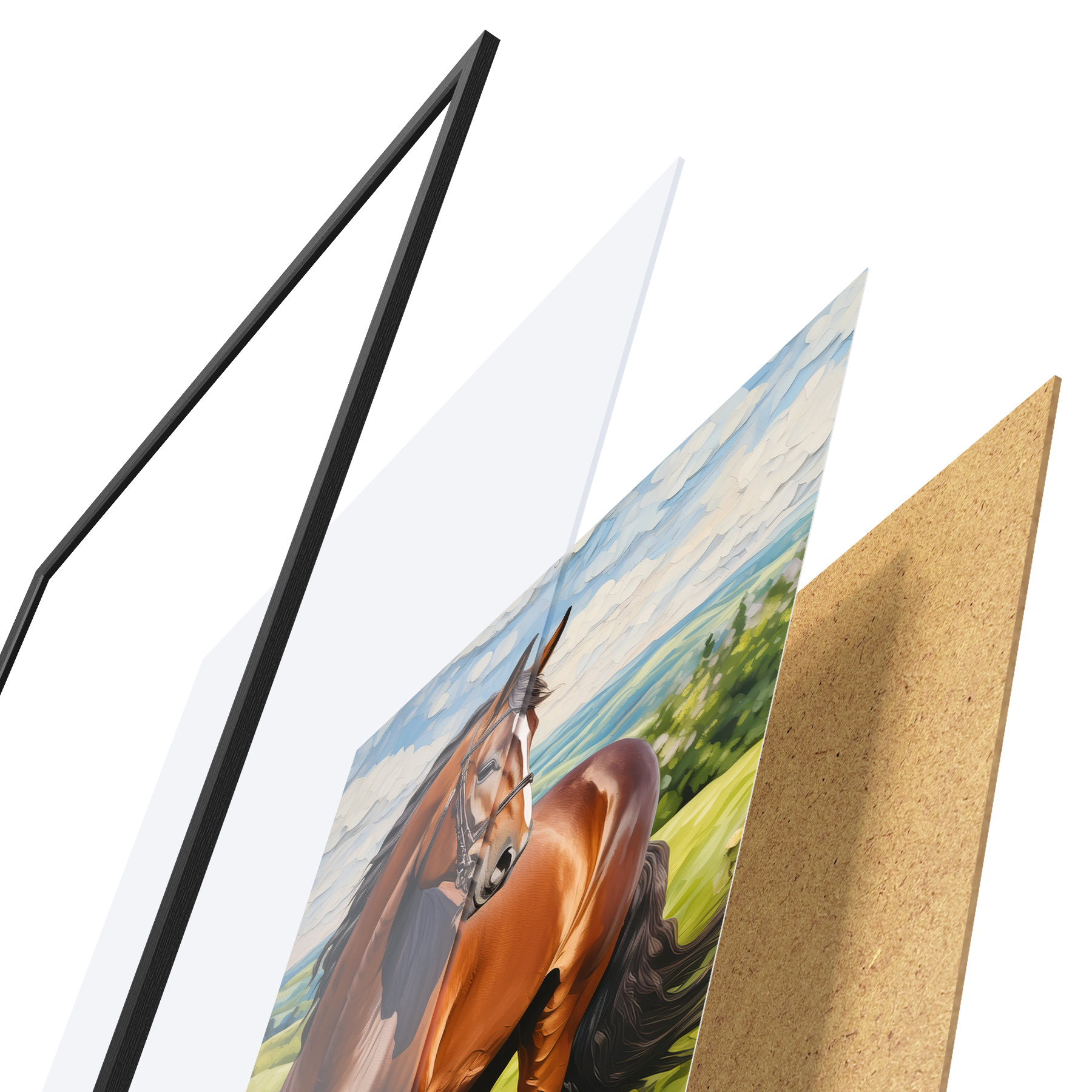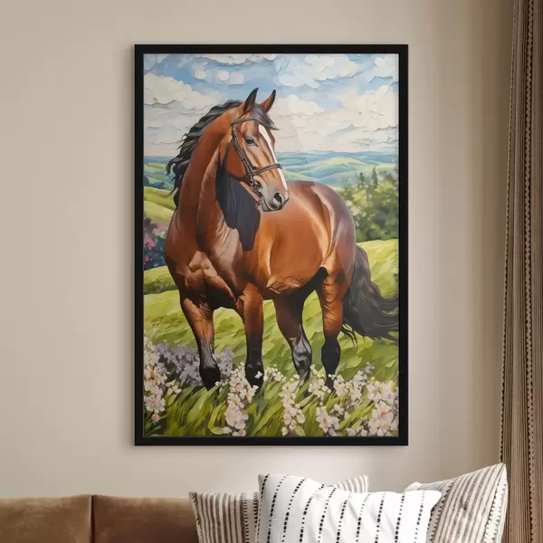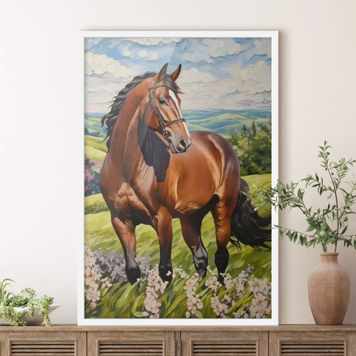 Plakatas Gražus arklys ant pievelės, mėlynas dangus f38727