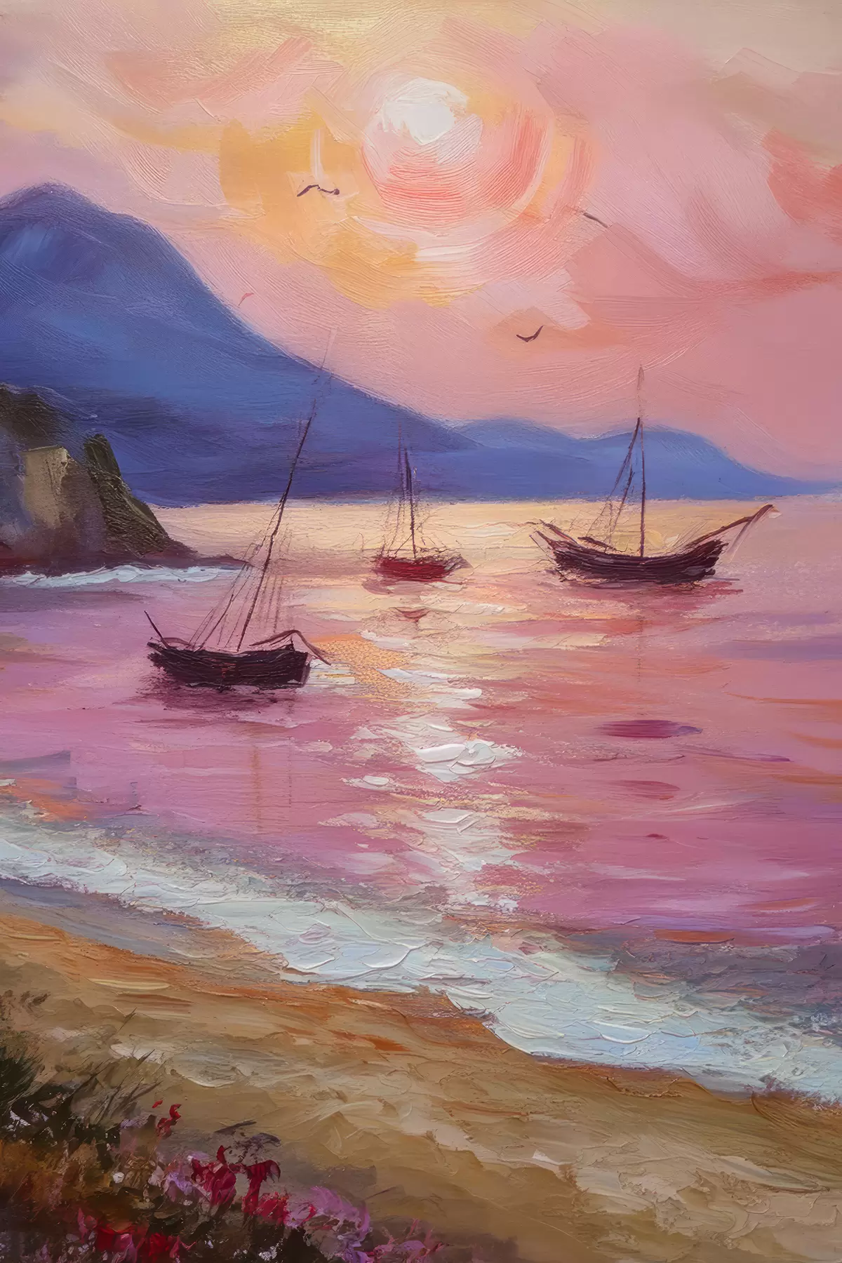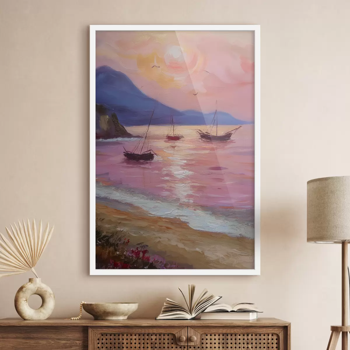 Plakatas Rožinis saulėtekis jūroje, su aliejiniais dažais f38731