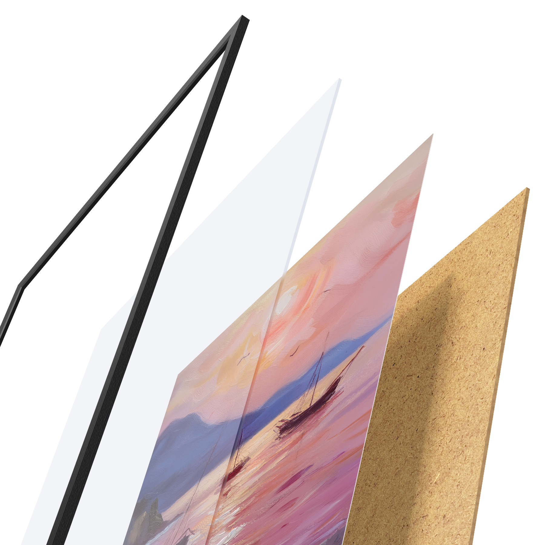 Plakatą sudaro rėmas, pleksiklas, atspausdintas vaizdas ir medžio drožlių plokštės pagrindas. Plakatą galima iš karto pakabinti ant sienos dėl kitoje pusėje esančių laikiklių.