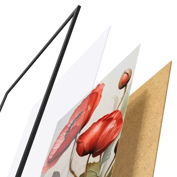 Plakatą sudaro rėmas, pleksiklas, atspausdintas vaizdas ir medžio drožlių plokštės pagrindas. Plakatą galima iš karto pakabinti ant sienos dėl kitoje pusėje esančių laikiklių.