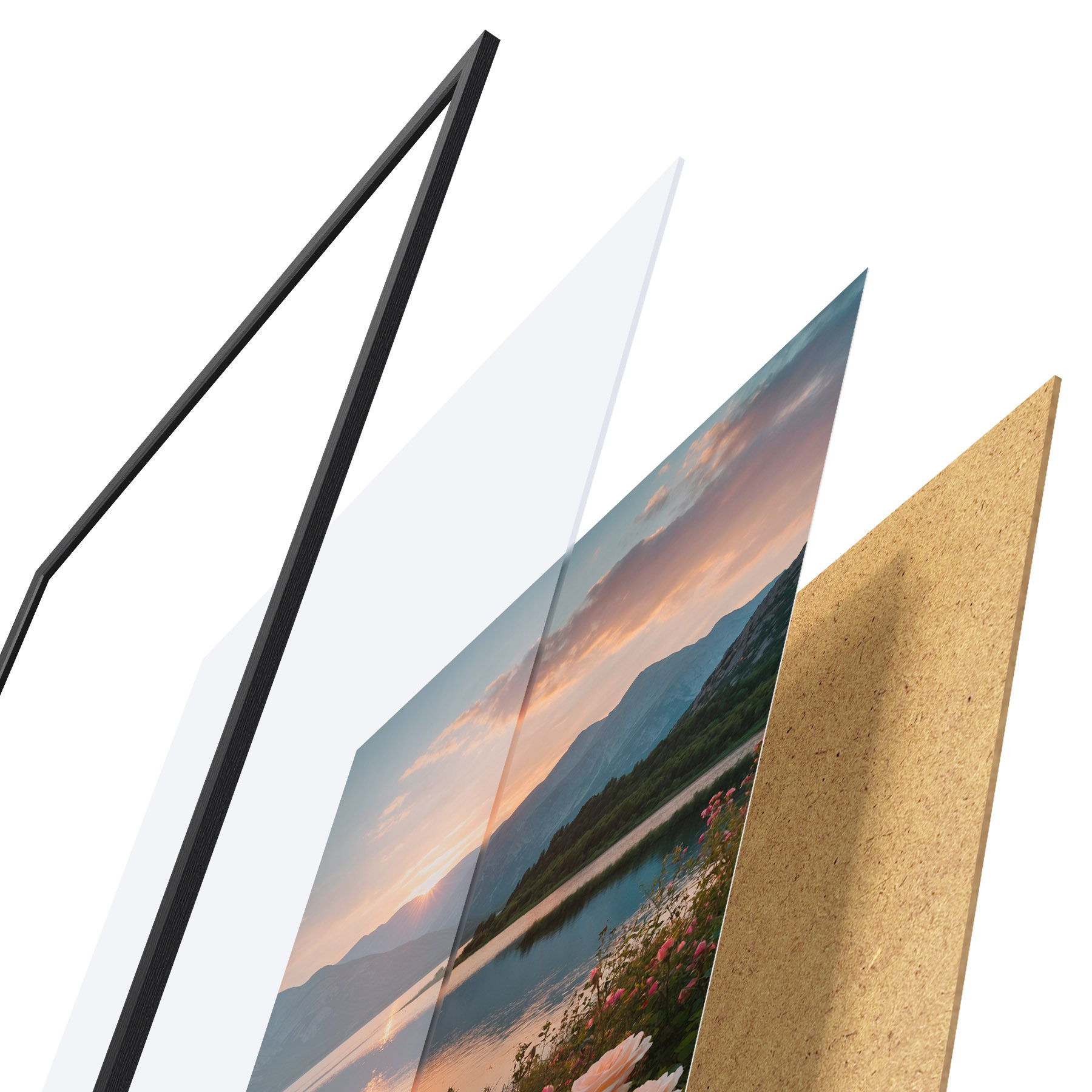 Plakatą sudaro rėmas, pleksiklas, atspausdintas vaizdas ir medžio drožlių plokštės pagrindas. Plakatą galima iš karto pakabinti ant sienos dėl kitoje pusėje esančių laikiklių.