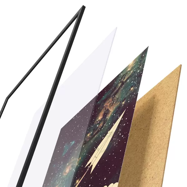 Plakatą sudaro rėmas, pleksiklas, atspausdintas vaizdas ir medžio drožlių plokštės pagrindas. Plakatą galima iš karto pakabinti ant sienos dėl kitoje pusėje esančių laikiklių.