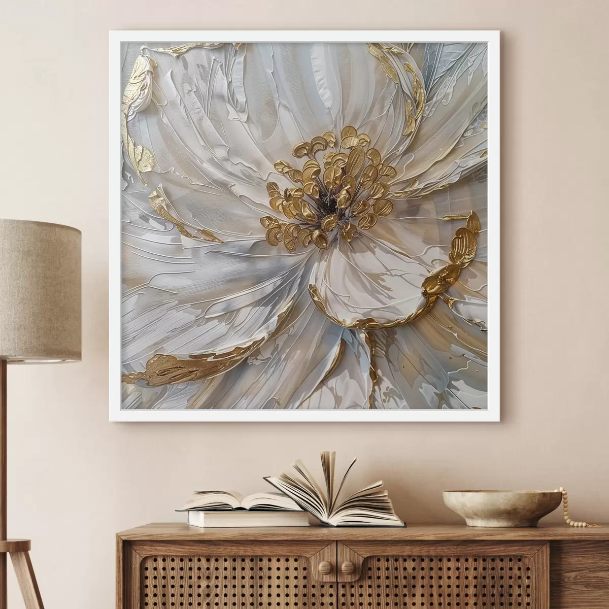 Plakatas Didelės baltos gėlės su geltonais erškėtrožėmis viduje stambiu planu, meninis aliejiniais dažais tapytas dekoras Ne f38755