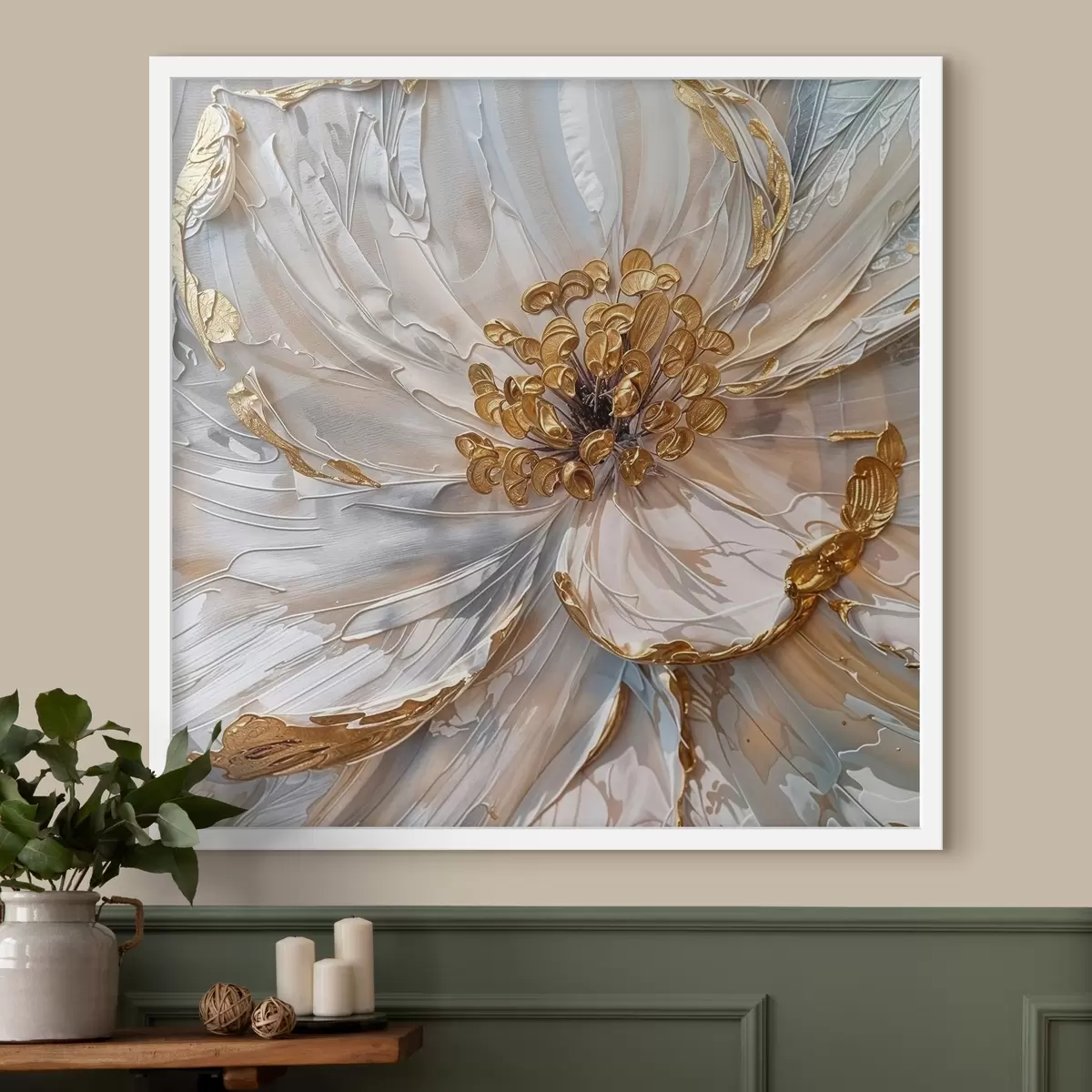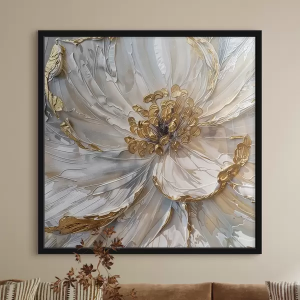 Plakatas Didelės baltos gėlės su geltonais erškėtrožėmis viduje stambiu planu, meninis aliejiniais dažais tapytas dekoras f38755