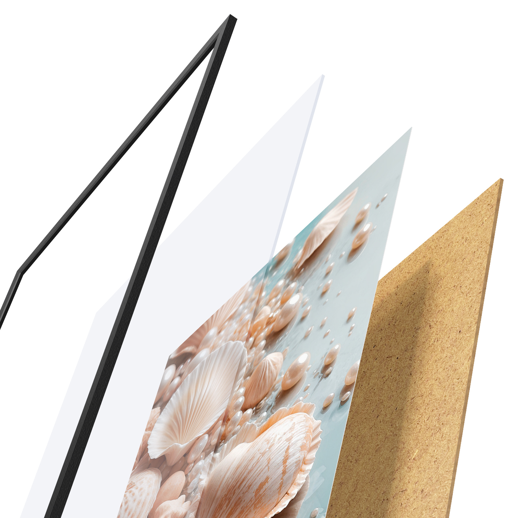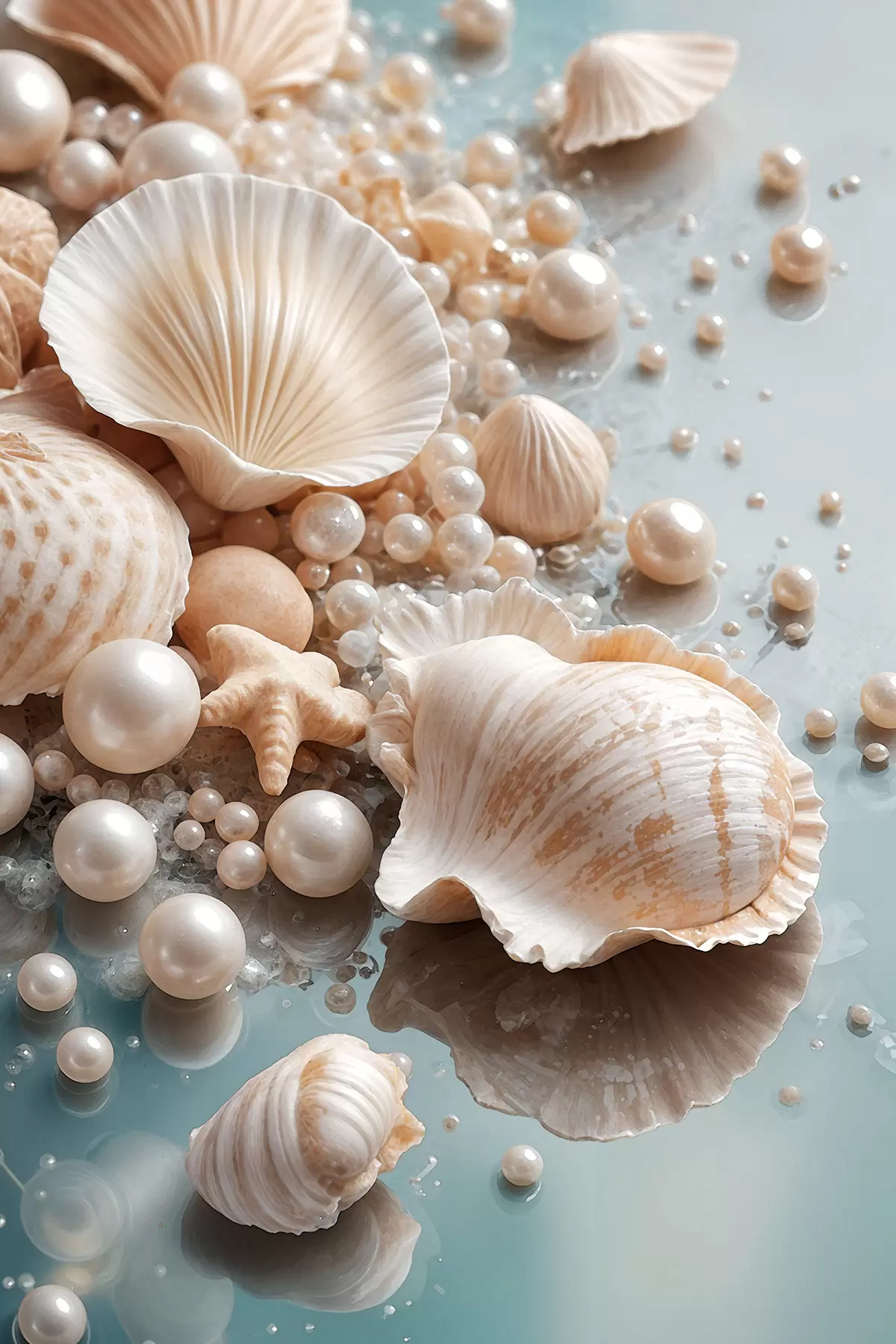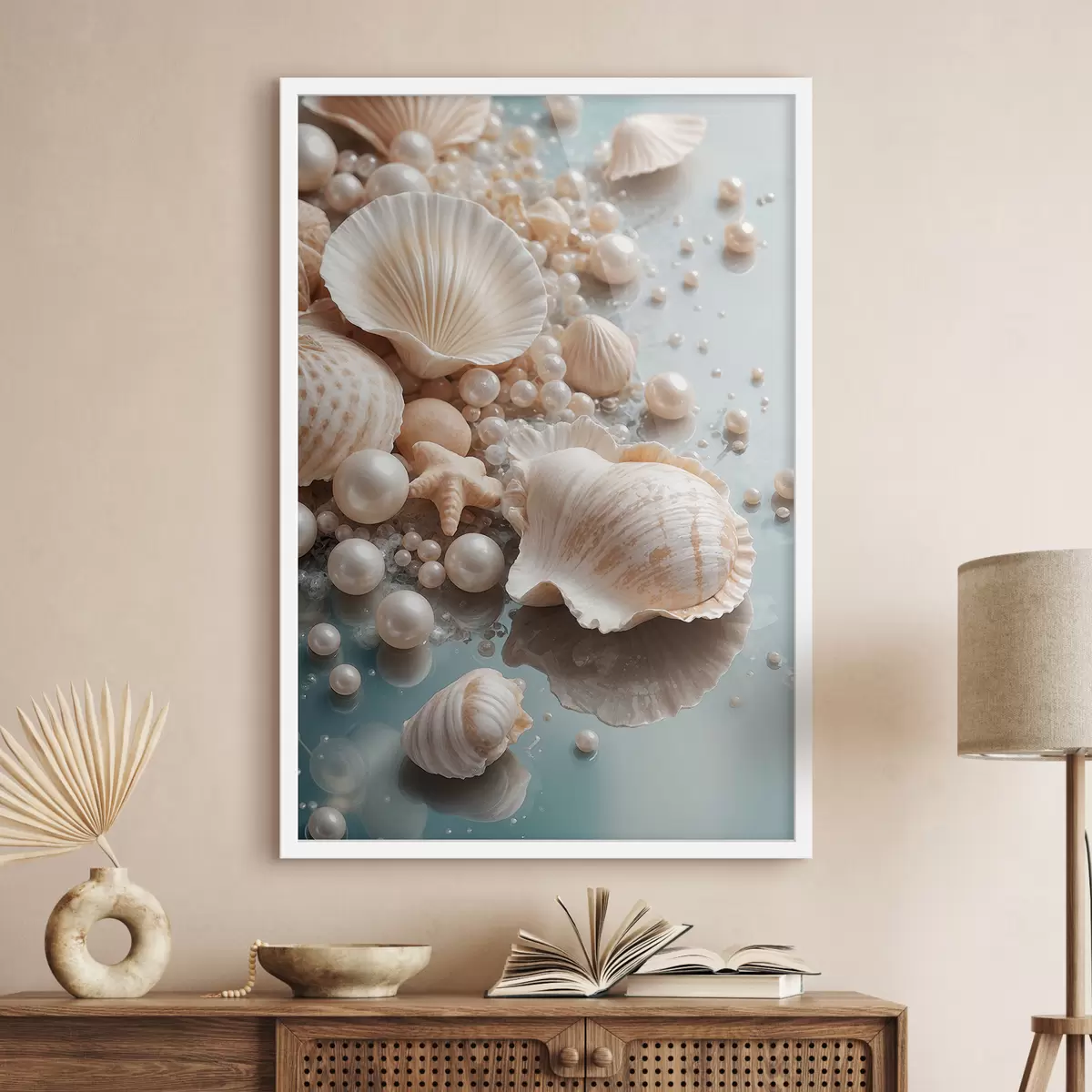 Plakatas Jūros kriauklių ir perlų asorti šviesiai mėlyname fone Ne f38769