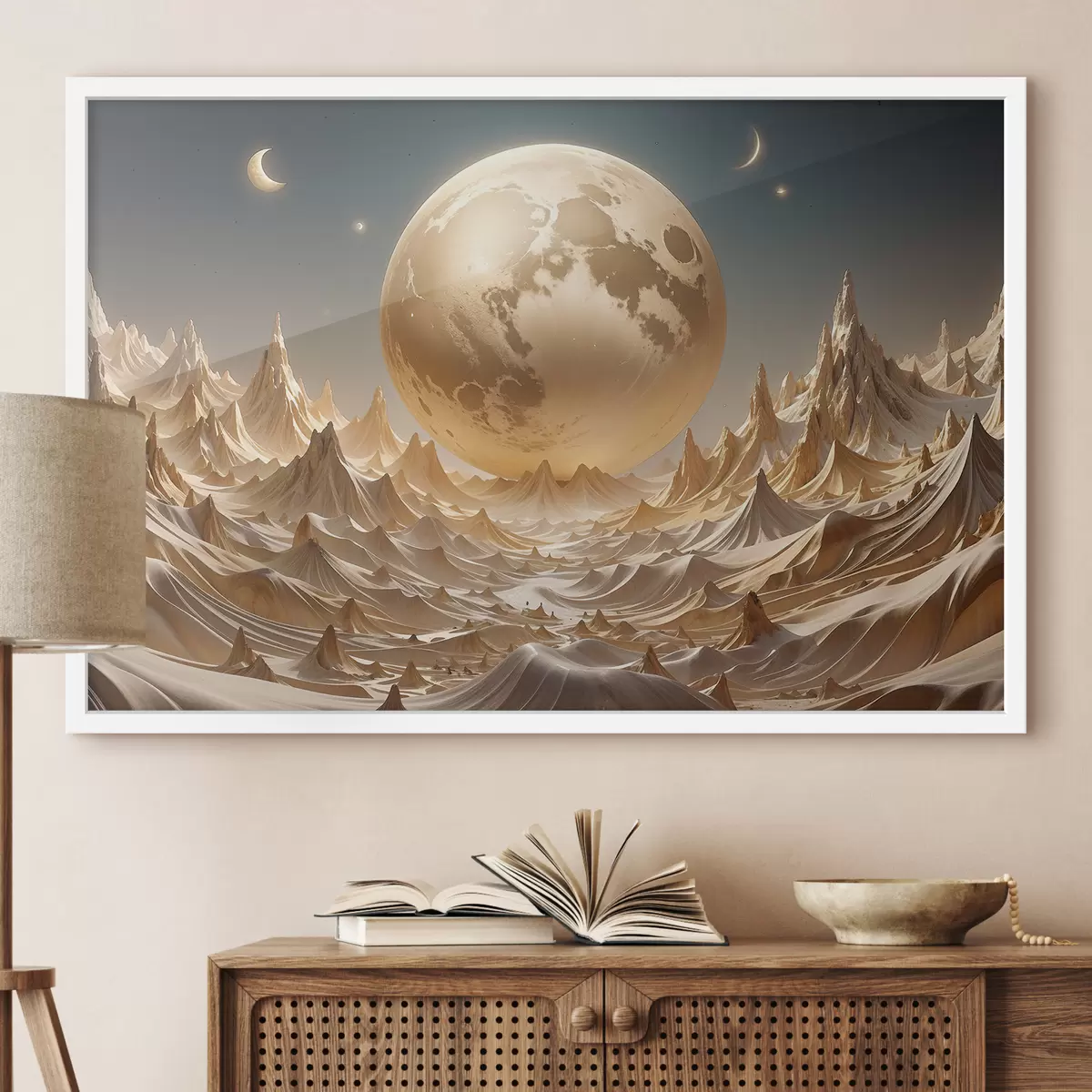 Plakatas Švytinti pilnatis virš siurrealistinio, kalnuoto kraštovaizdžio su viršūnėmis Ne f38775
