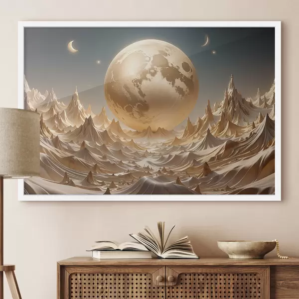 Plakatas Švytinti pilnatis virš siurrealistinio, kalnuoto kraštovaizdžio su viršūnėmis f38775