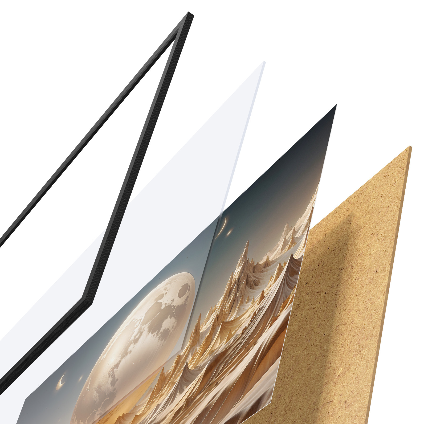 Plakatą sudaro rėmas, pleksiklas, atspausdintas vaizdas ir medžio drožlių plokštės pagrindas. Plakatą galima iš karto pakabinti ant sienos dėl kitoje pusėje esančių laikiklių.