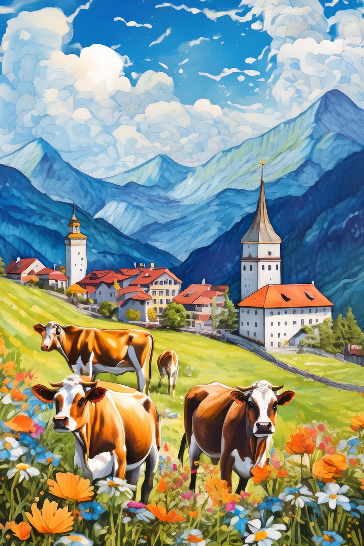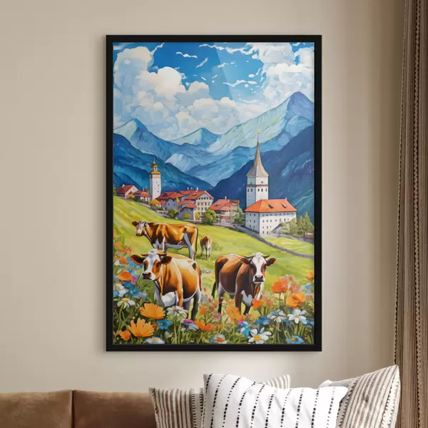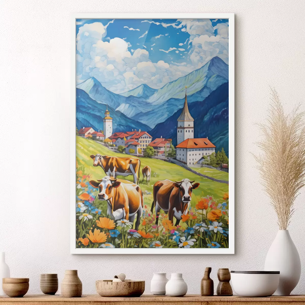 Plakatas Karvės pievoje su gėlėmis Alpių kalnuose f38808