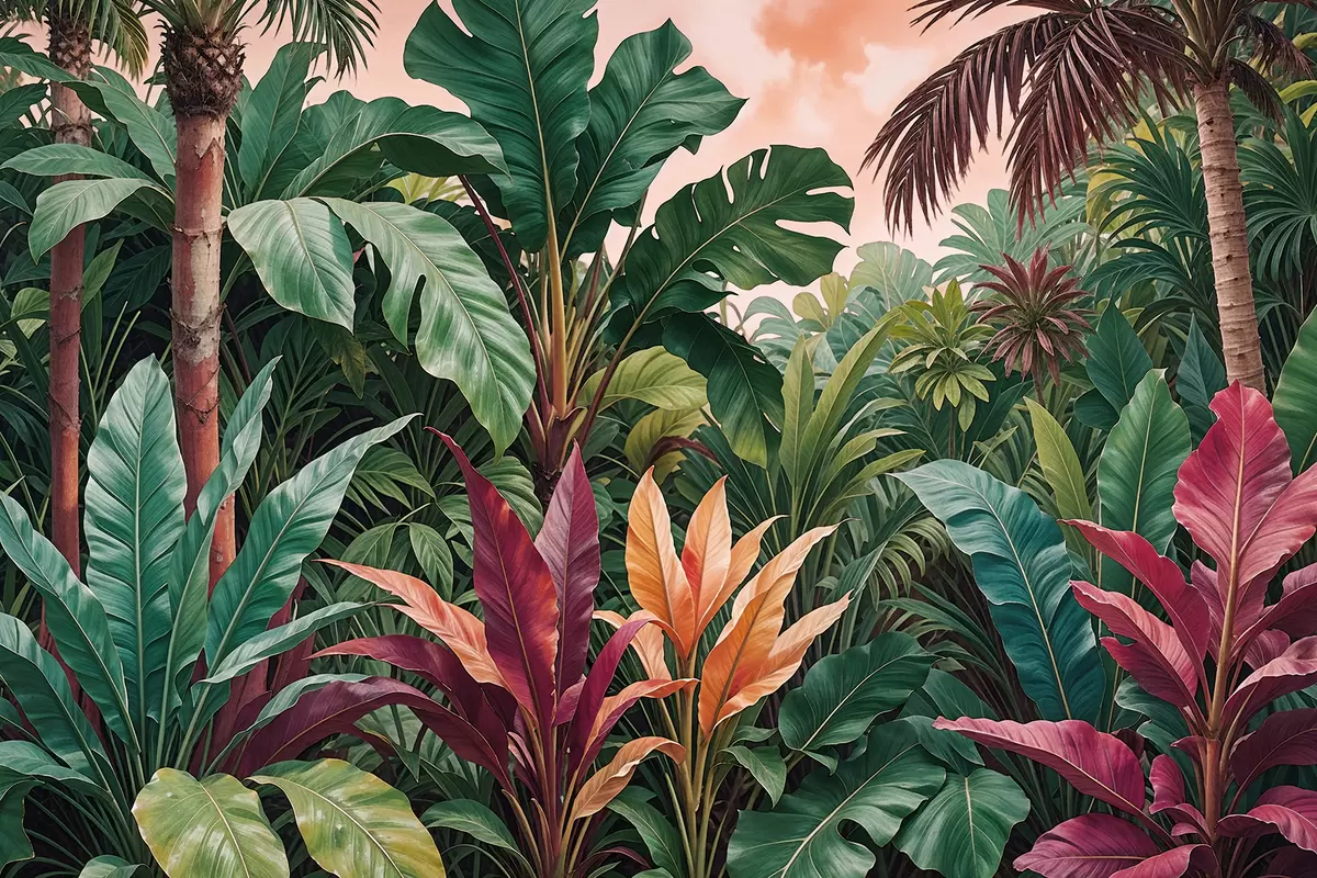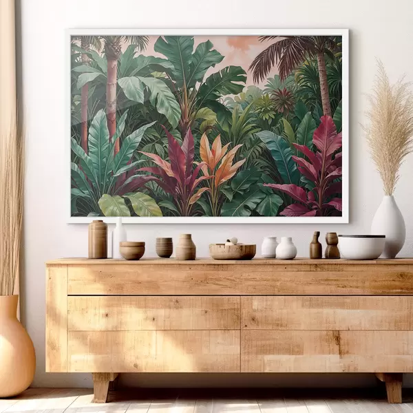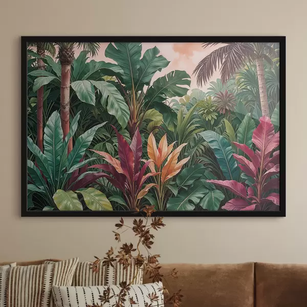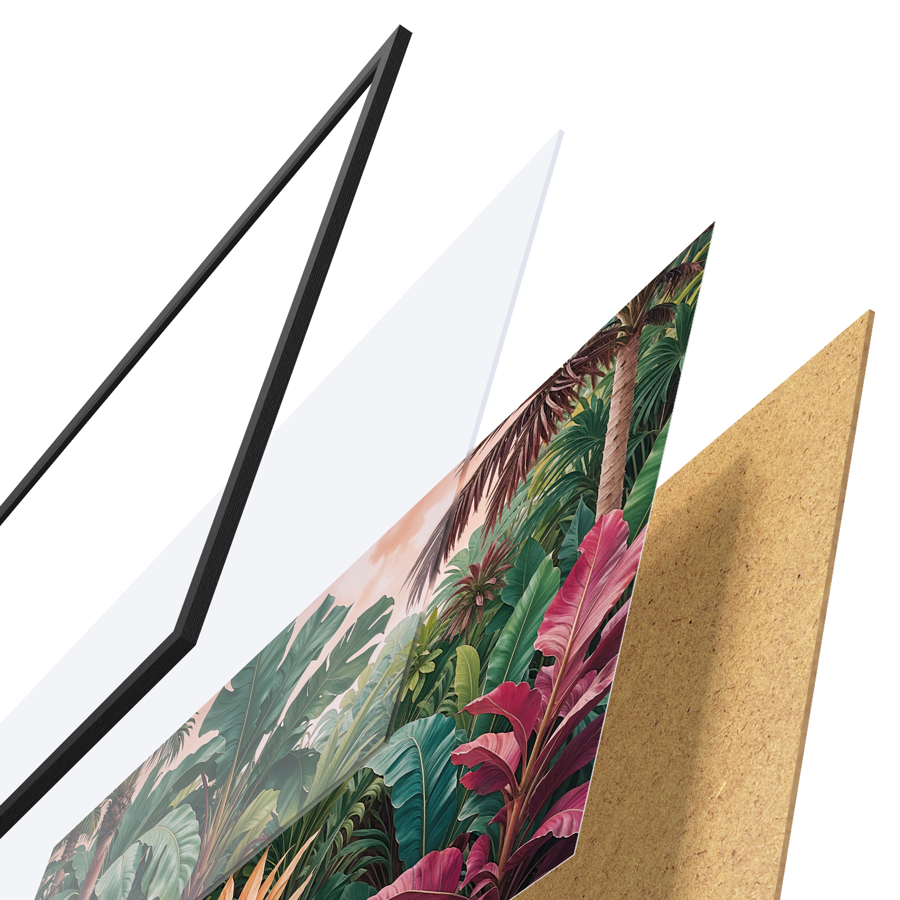 Plakatas Vešlios atogrąžų džiunglės su ryškiai žaliais lapais, palmių lapais ir spalvingomis gėlėmis f38817