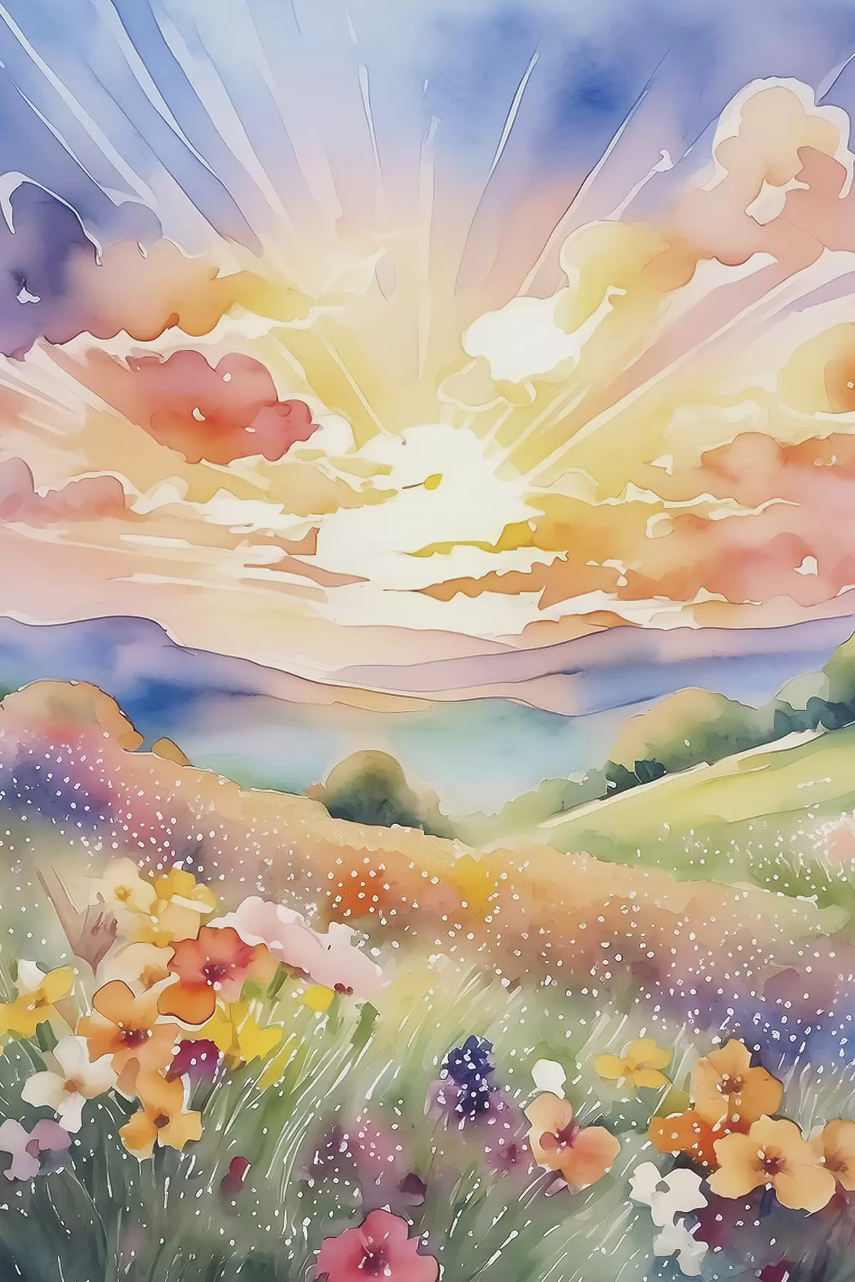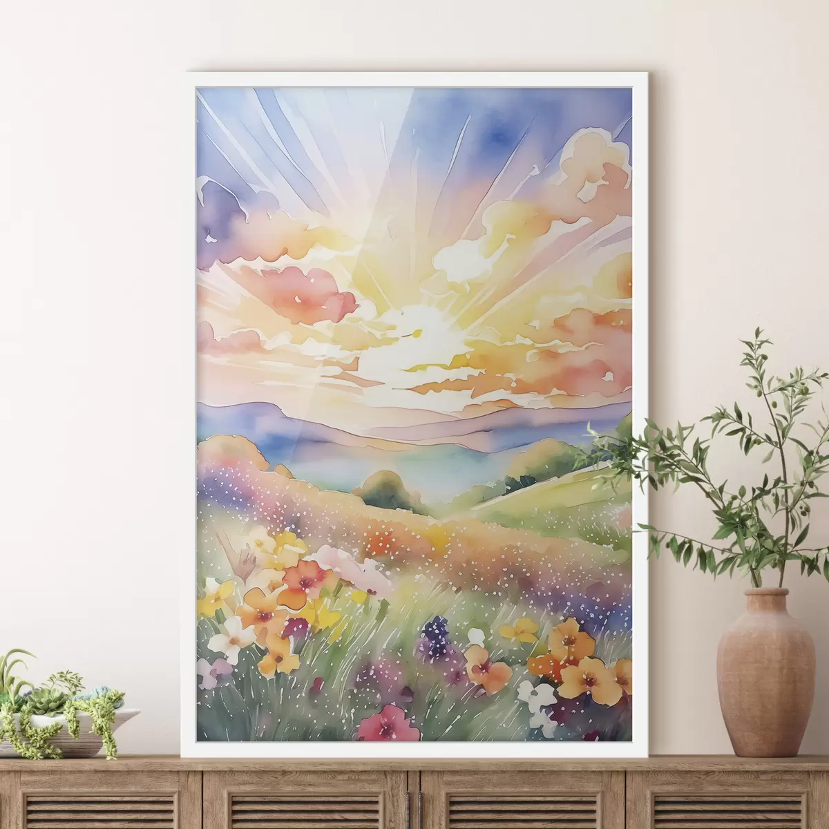 Plakatas Saulėlydis vasaros lauke, gėlės, saulė, spalvingas dangus, debesys, gamta f38842