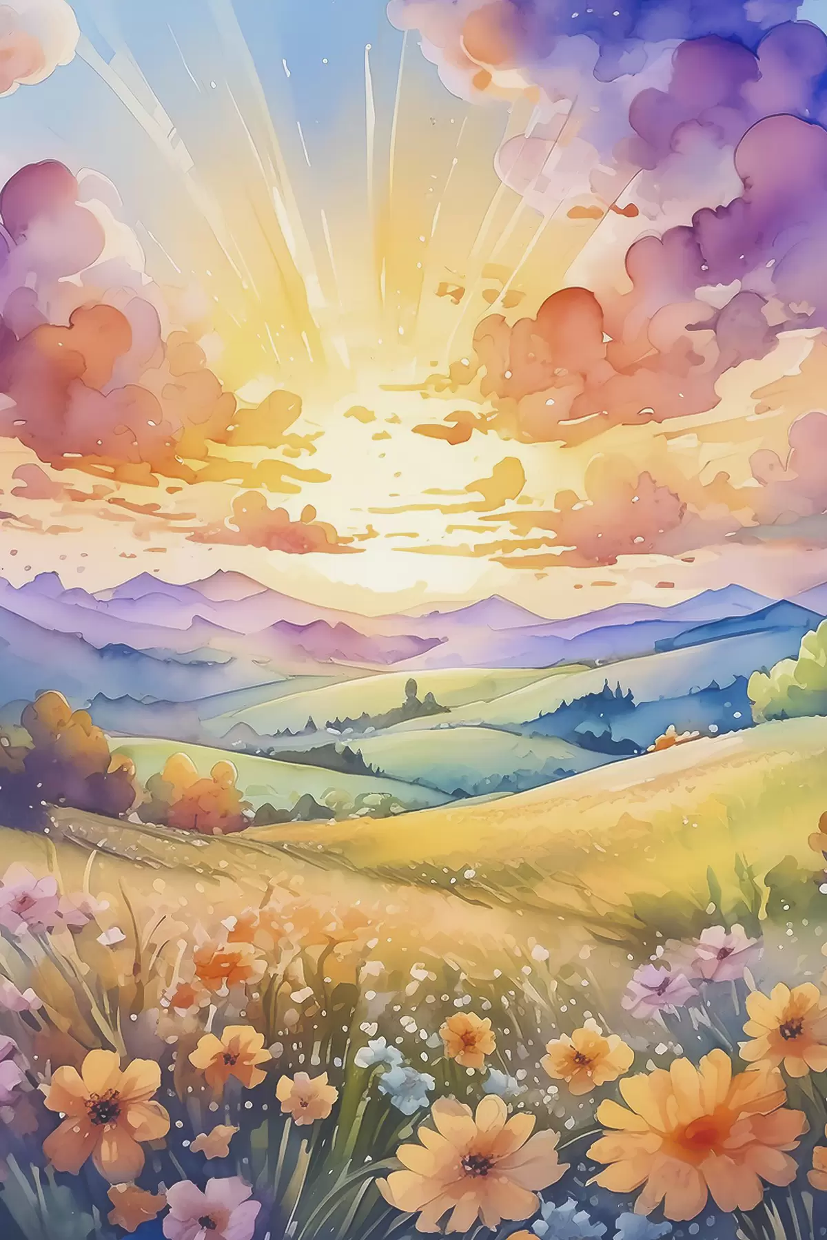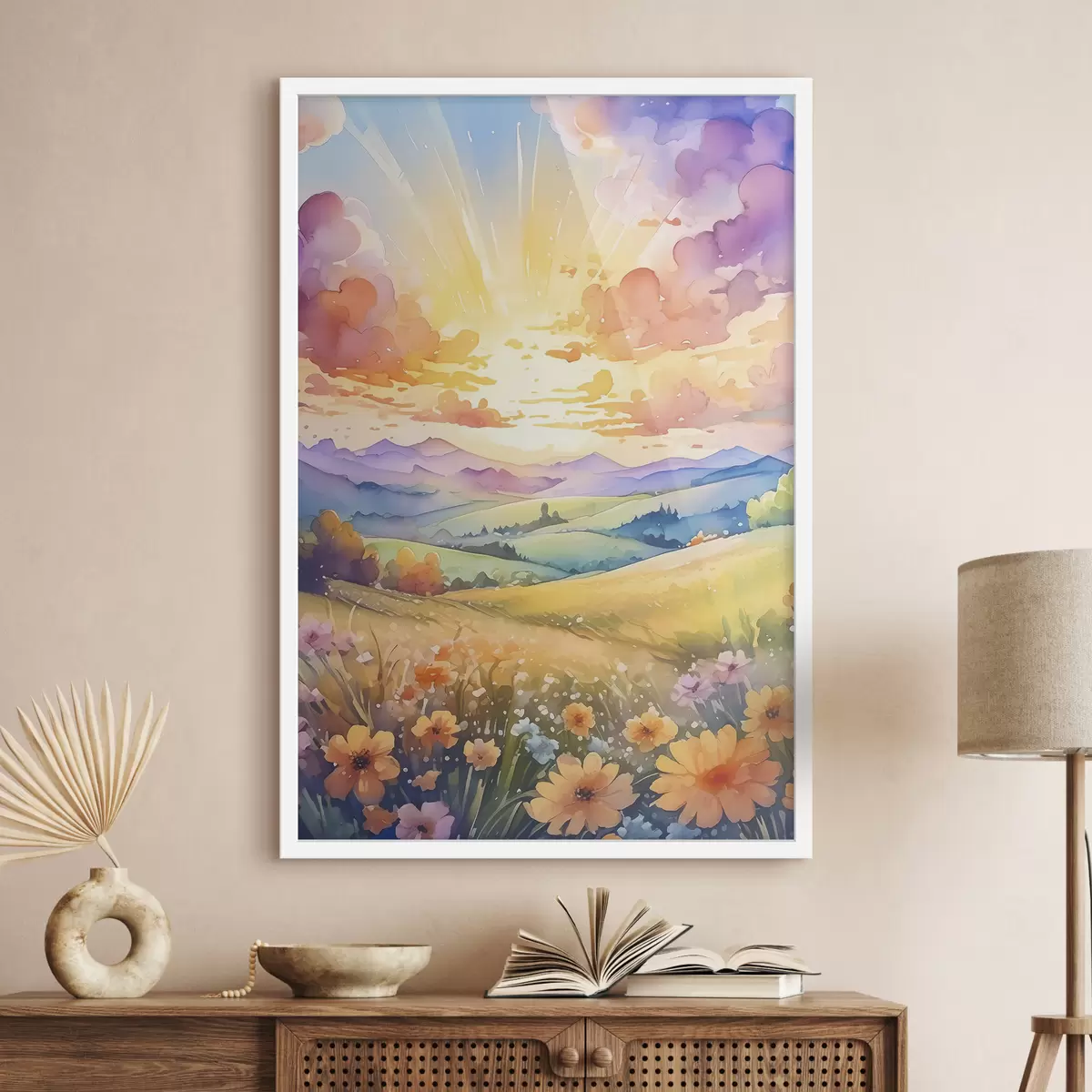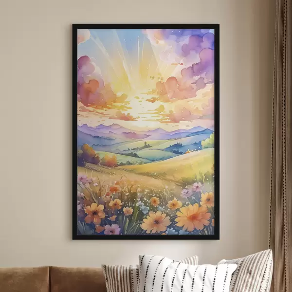 Plakatas Vasaros pieva, spalvingas dangus su debesimis, medžiais ir gėlėmis, kalnų peizažas f38844