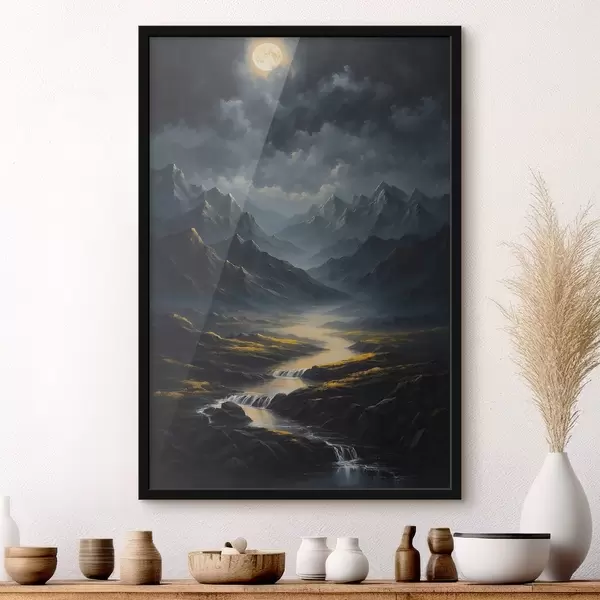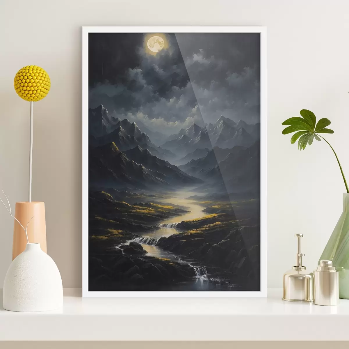 Plakatas Mėnulio apšviesti kalnai prie ramių vandenų f38857