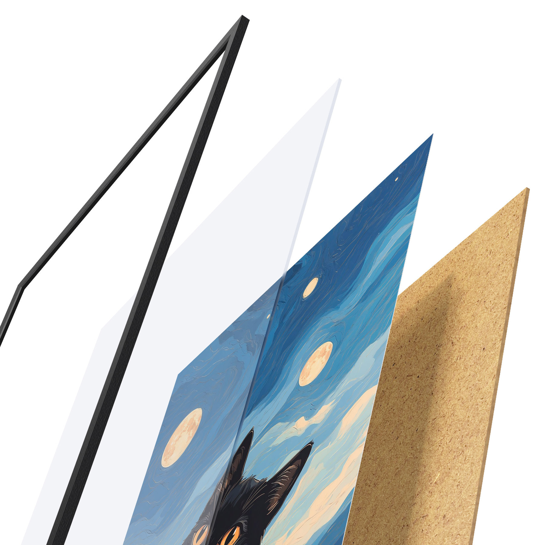 Plakatą sudaro rėmas, pleksiklas, atspausdintas vaizdas ir medžio drožlių plokštės pagrindas. Plakatą galima iš karto pakabinti ant sienos dėl kitoje pusėje esančių laikiklių.