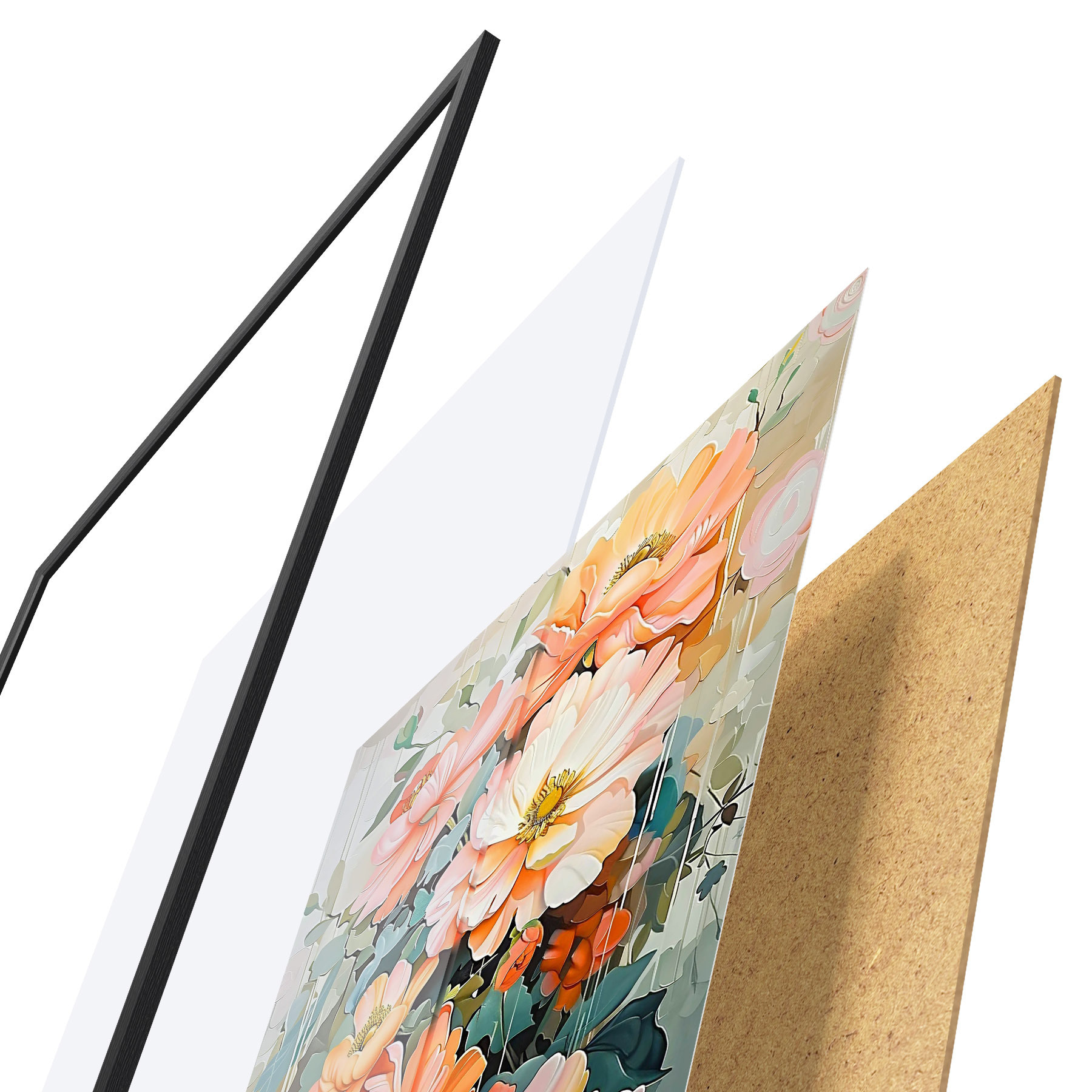 Plakatą sudaro rėmas, pleksiklas, atspausdintas vaizdas ir medžio drožlių plokštės pagrindas. Plakatą galima iš karto pakabinti ant sienos dėl kitoje pusėje esančių laikiklių.