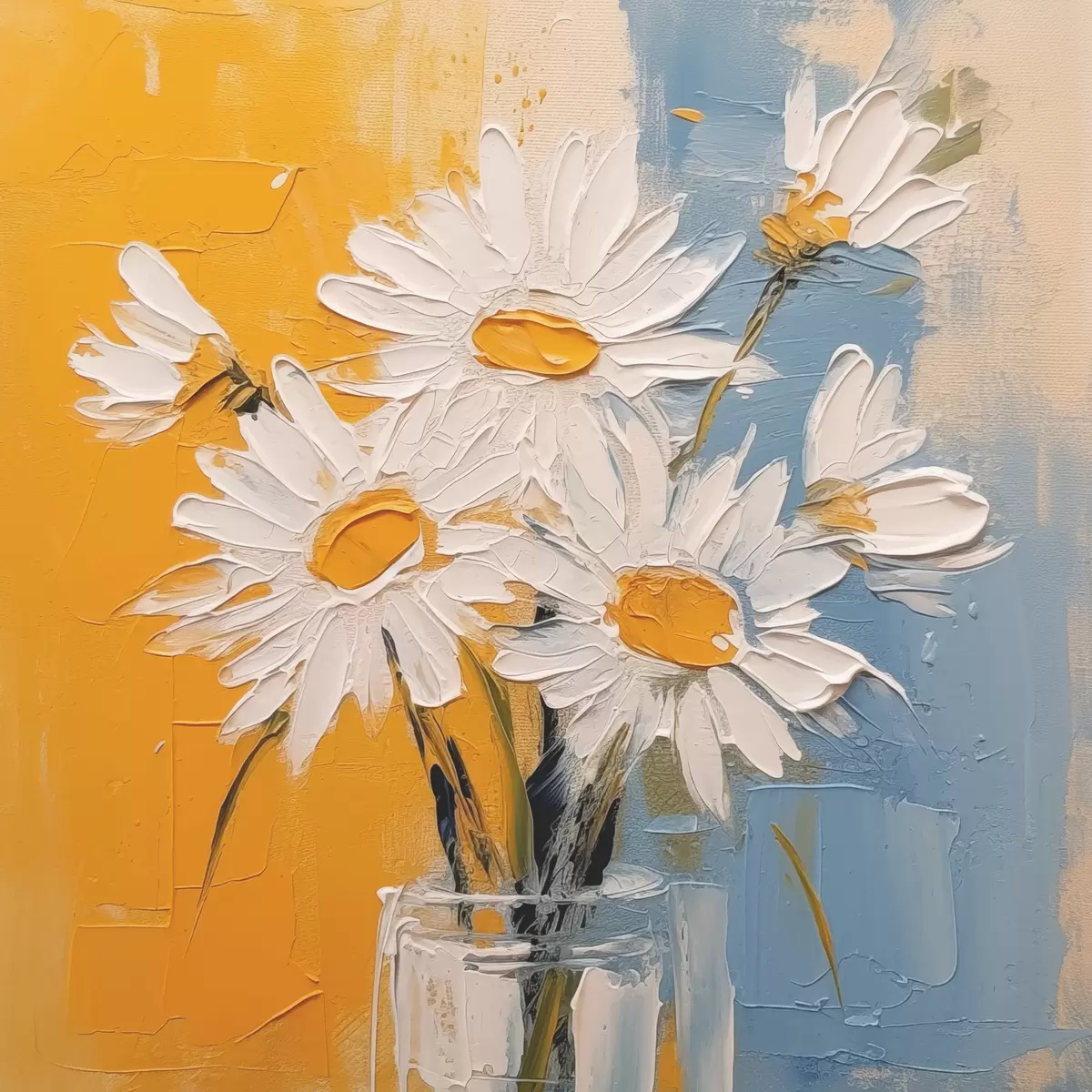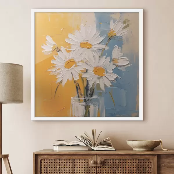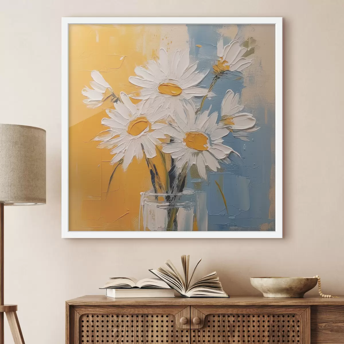 Plakatas Baltos ramunėlės stiklinėje vazoje mėlyname ir geltoname fone, aliejinės tapybos imitacija, dideli potėpiai f38907