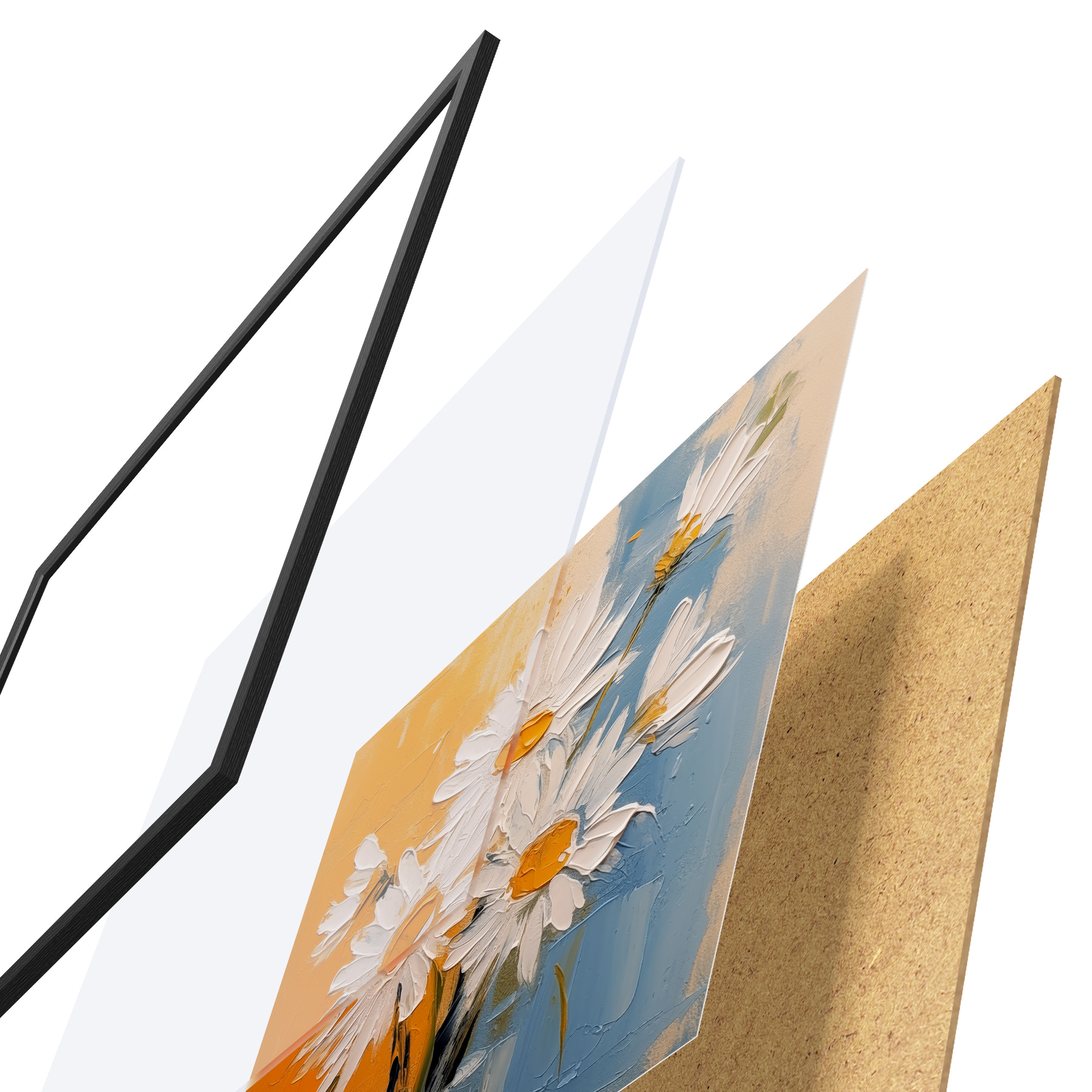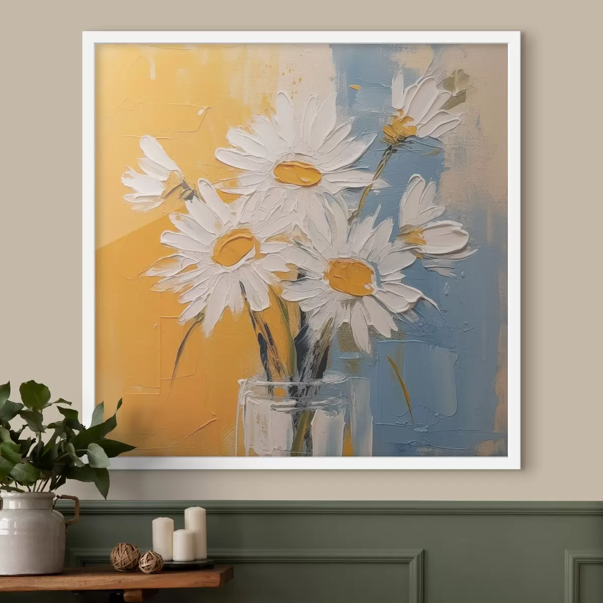 Plakatas Baltos ramunėlės stiklinėje vazoje mėlyname ir geltoname fone, aliejinės tapybos imitacija, dideli potėpiai Ne f38907