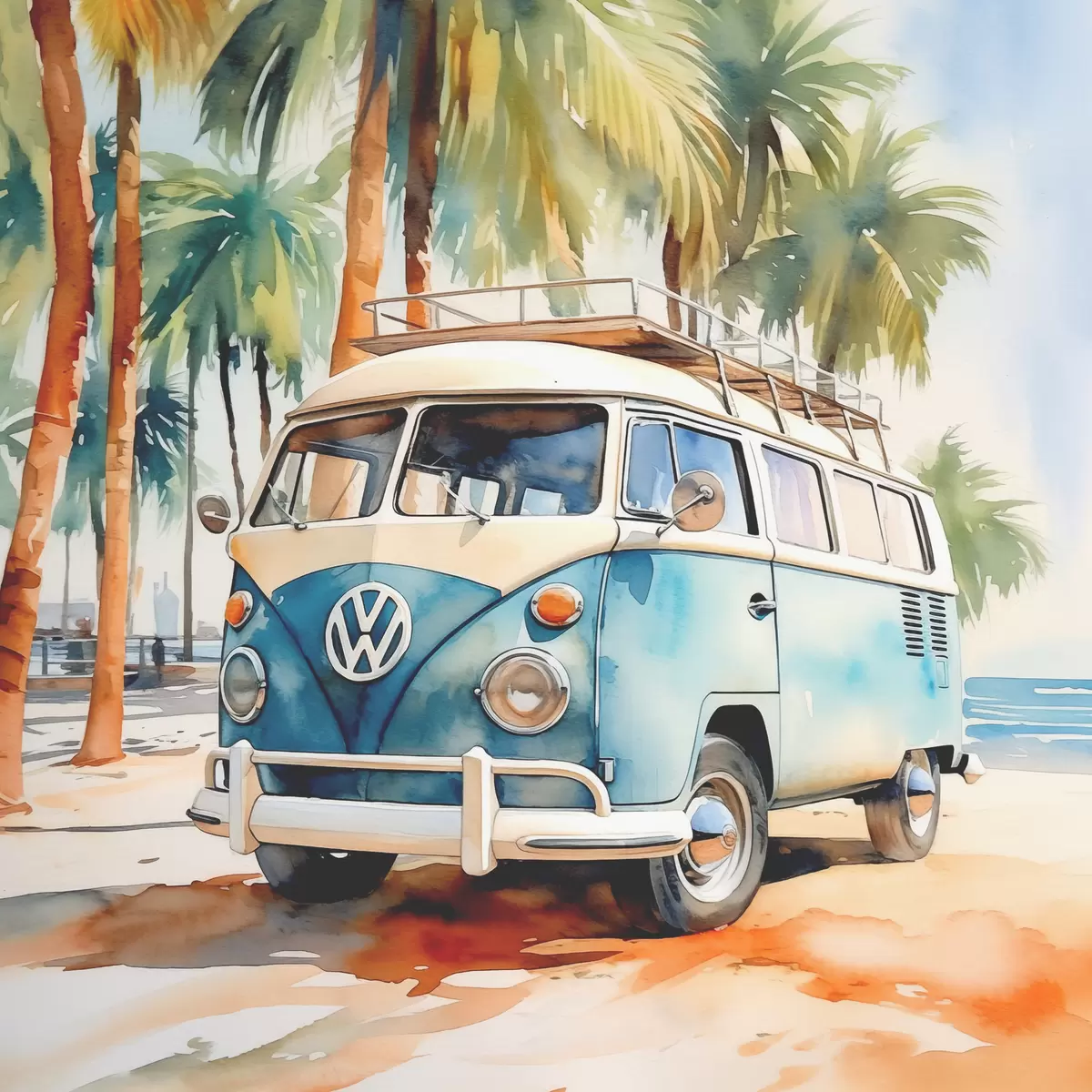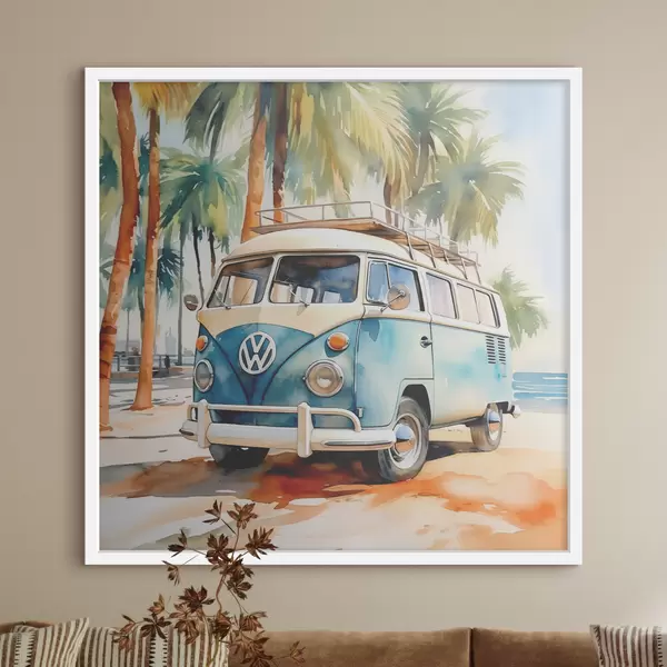 Plakatas Paplūdimyje stovi kelioninis automobilis akvarelinių palmių fone f38911