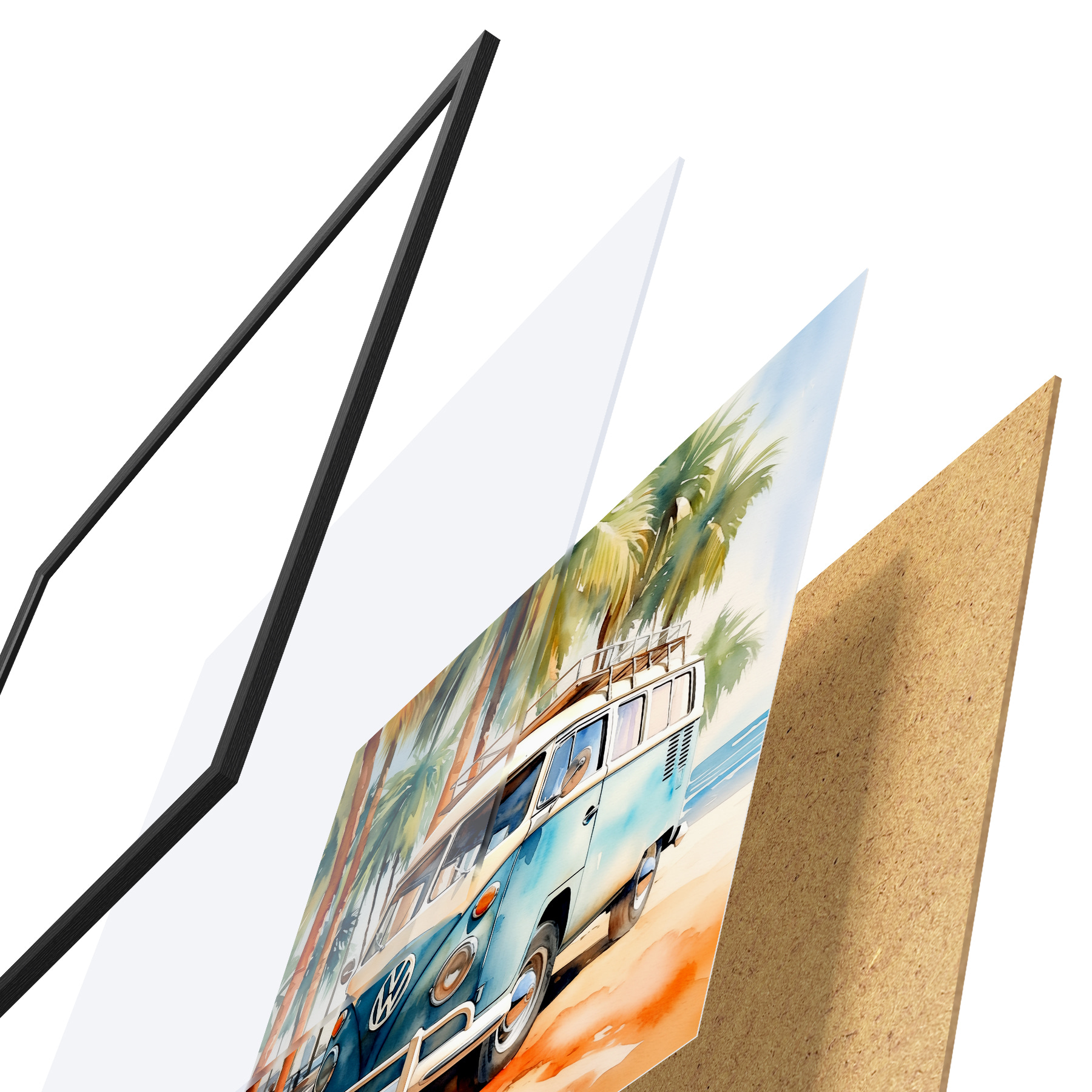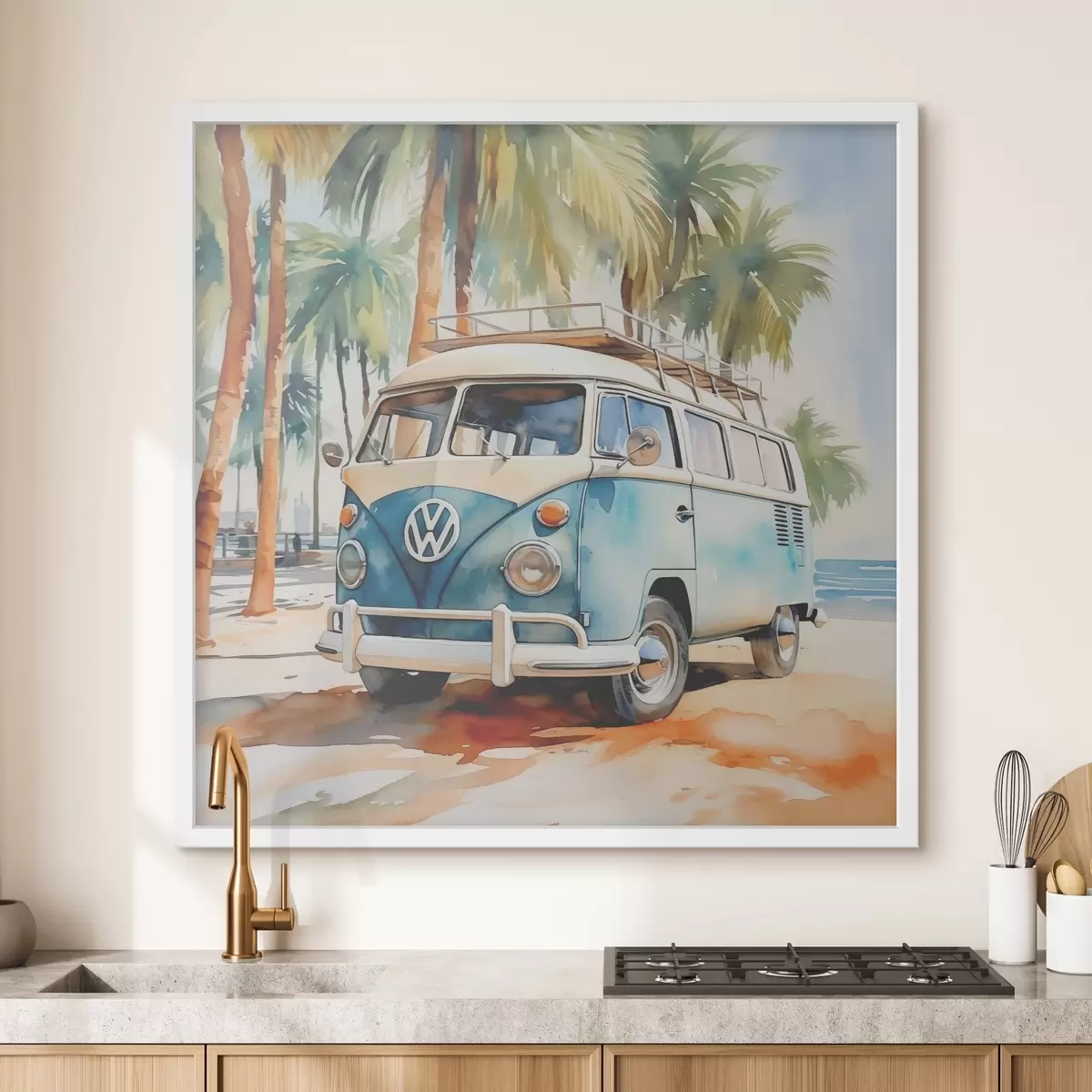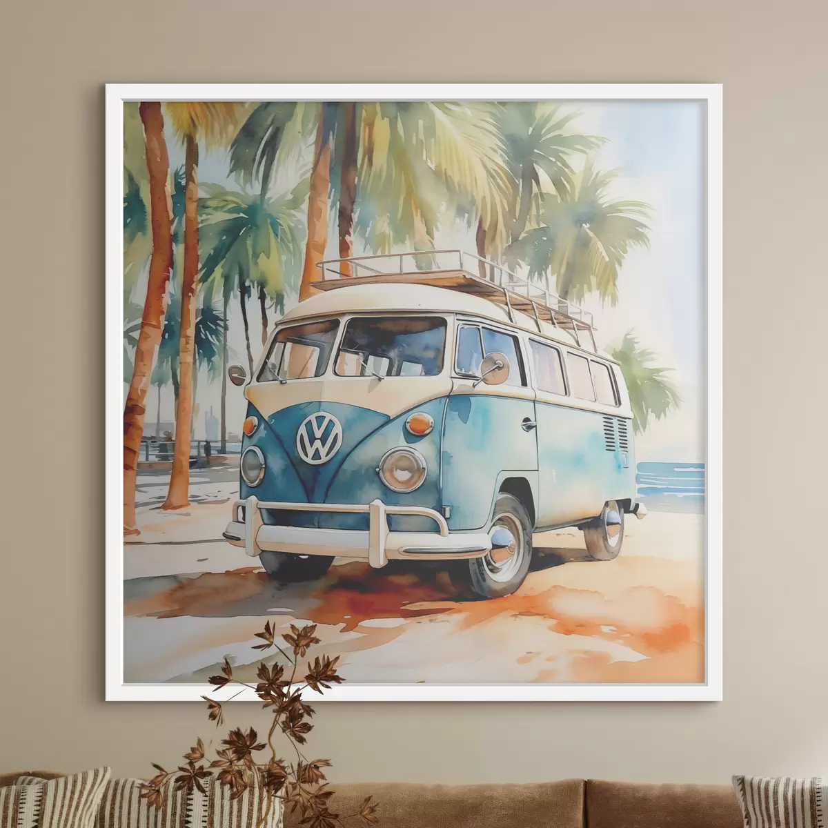 Plakatas Paplūdimyje stovi kelioninis automobilis akvarelinių palmių fone Ne f38911