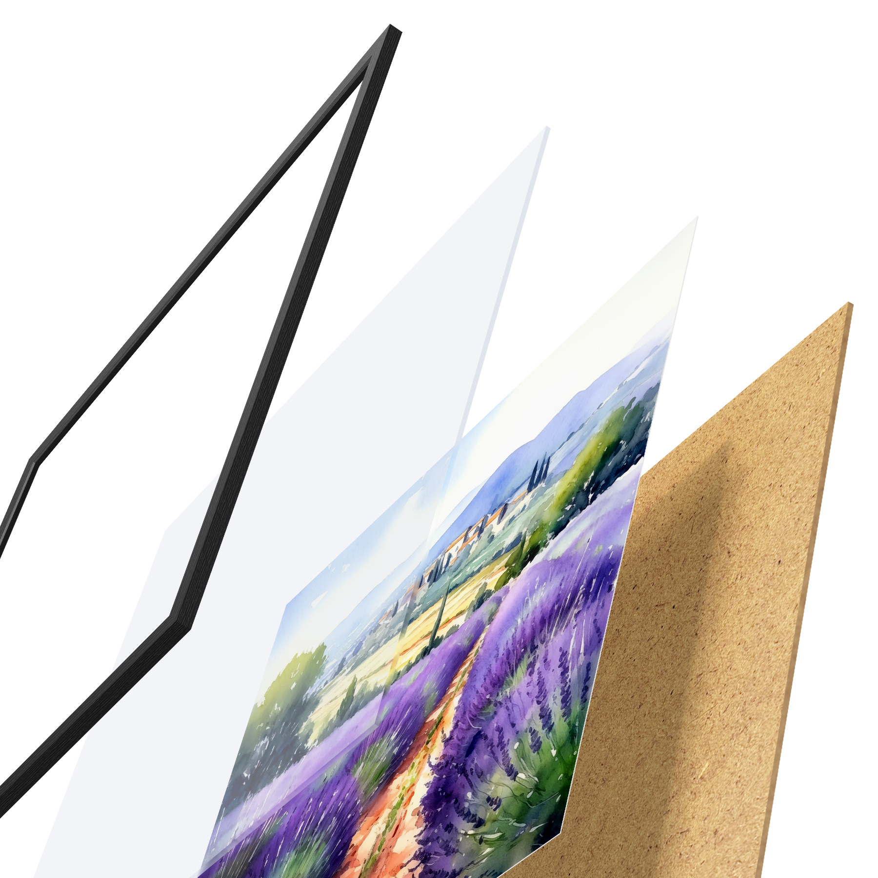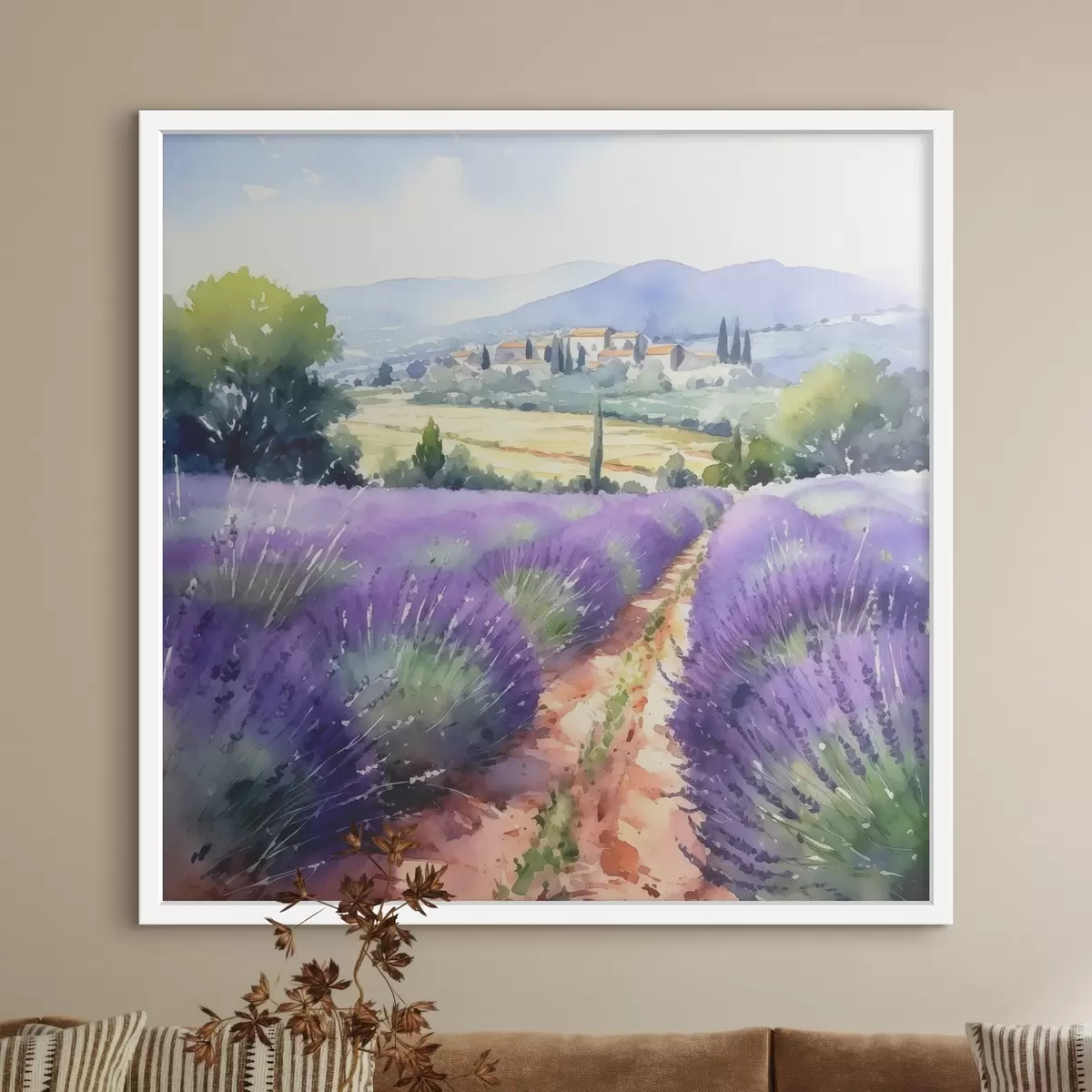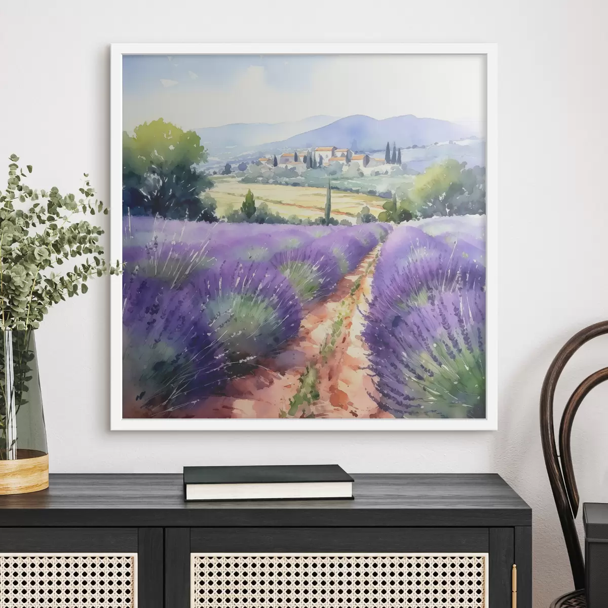 Plakatas Akvarelinis levandų laukas kalnų ir kaimo fone f38913