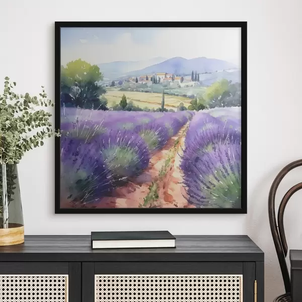 Plakatas Akvarelinis levandų laukas kalnų ir kaimo fone f38913