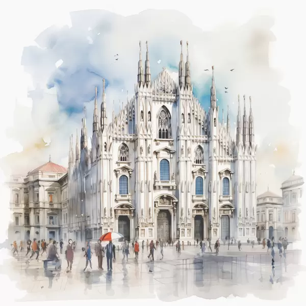 Plakatas Milano Duomo, architektūra, miestas, lietus, akvarelė, mėlyna, pilka, žmonės vaikšto Ne f38938