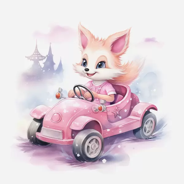 Plakatas Lapė vairuoja rožinį automobilį. Akvarelinė iliustracija vaikams Ne f38943
