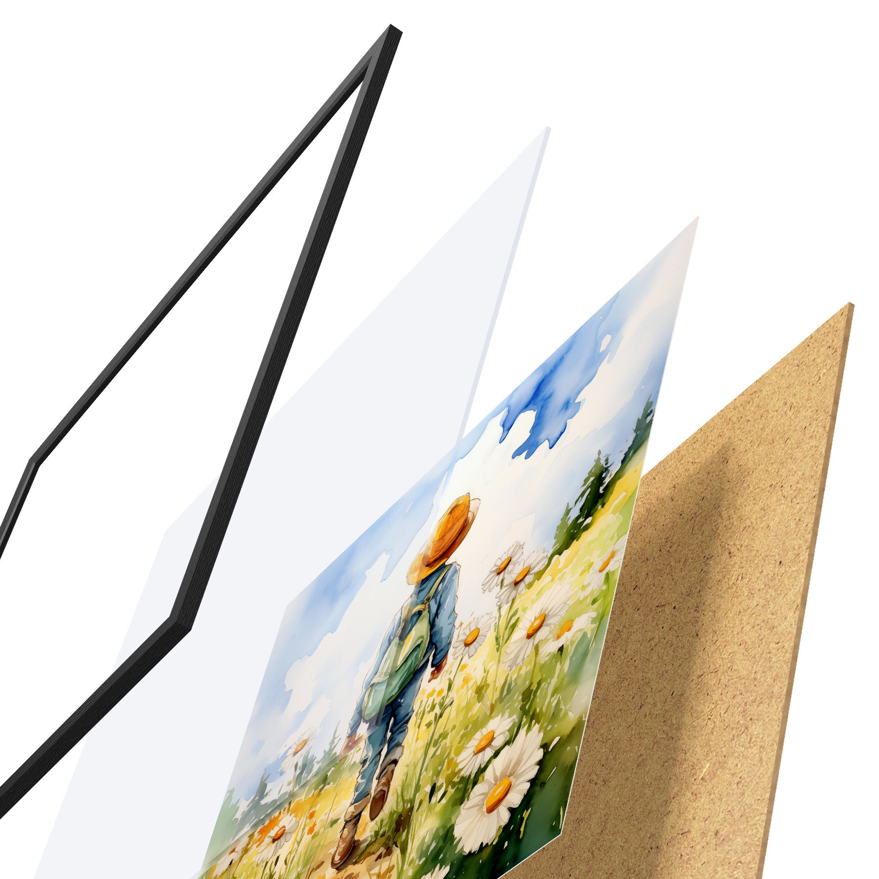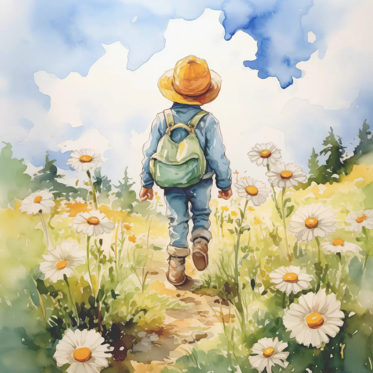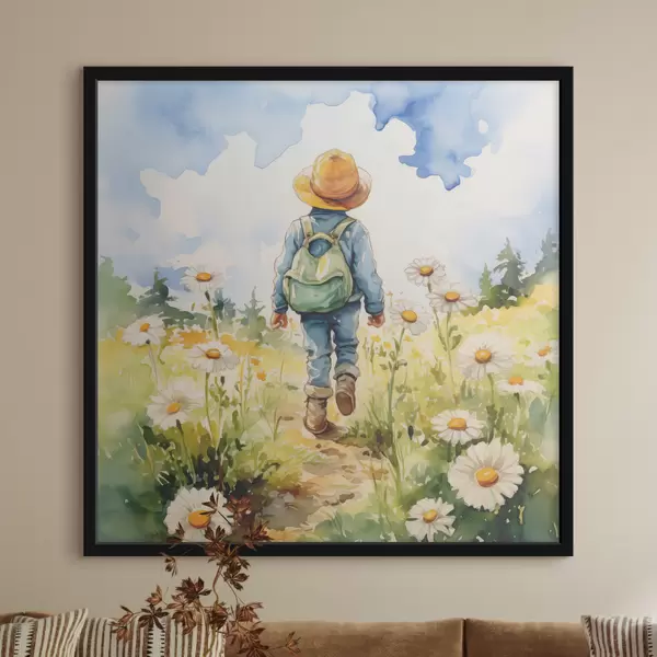 Plakatas Vaikinas kaubojiška kepure su žalia kuprine už nugaros ir mėlynu kostiumu eina taku ramunėlių lauke, akvarelė f38946