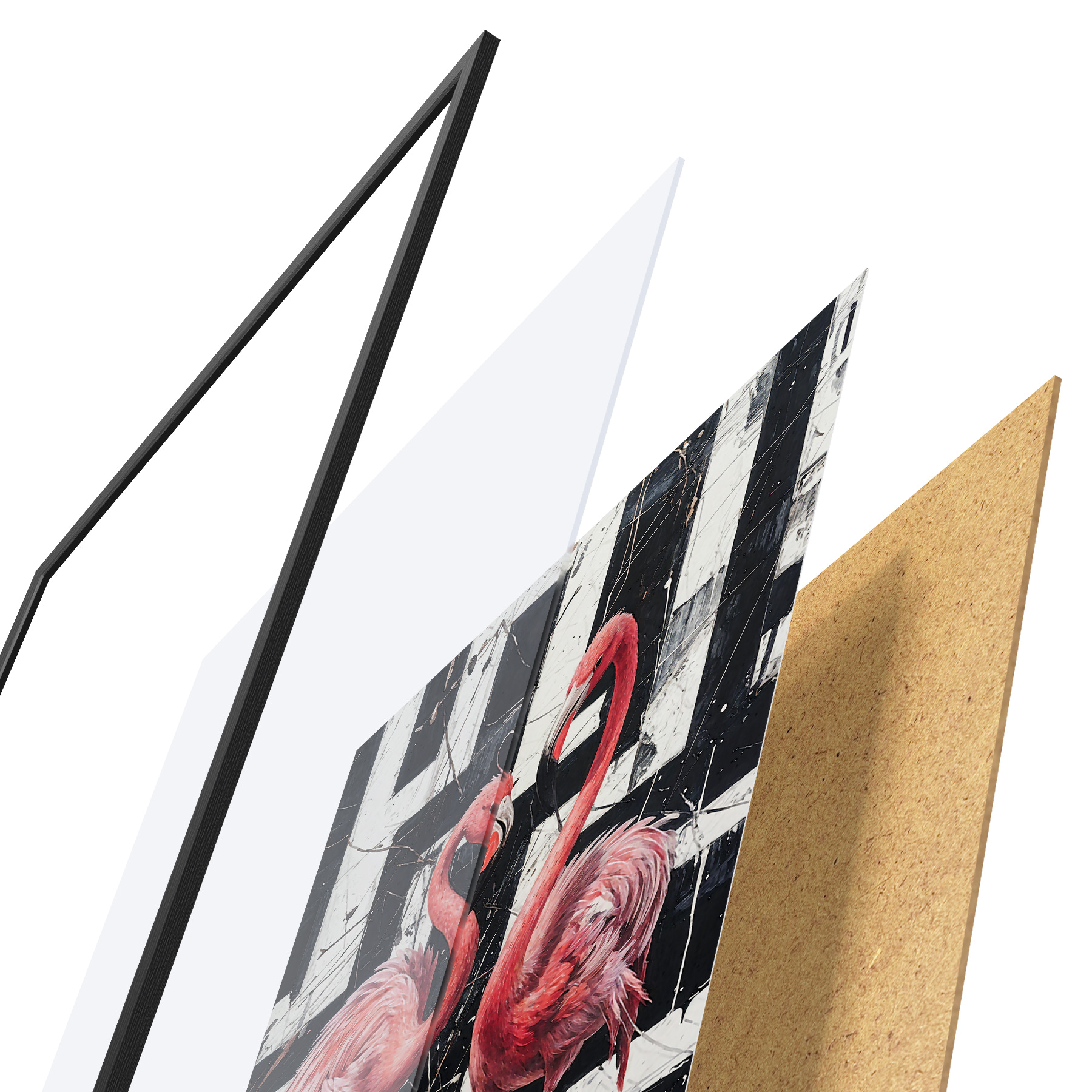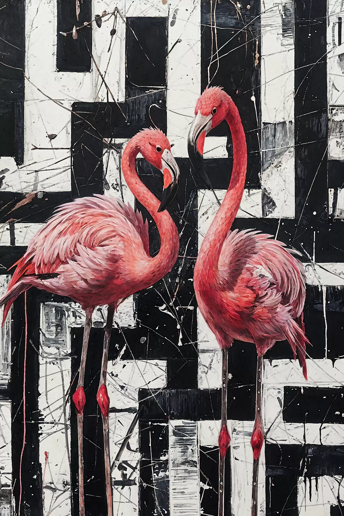 Plakatas Du rožiniai flamingai stovi prieš juodai baltą abstrakčių fono paveikslą f38954