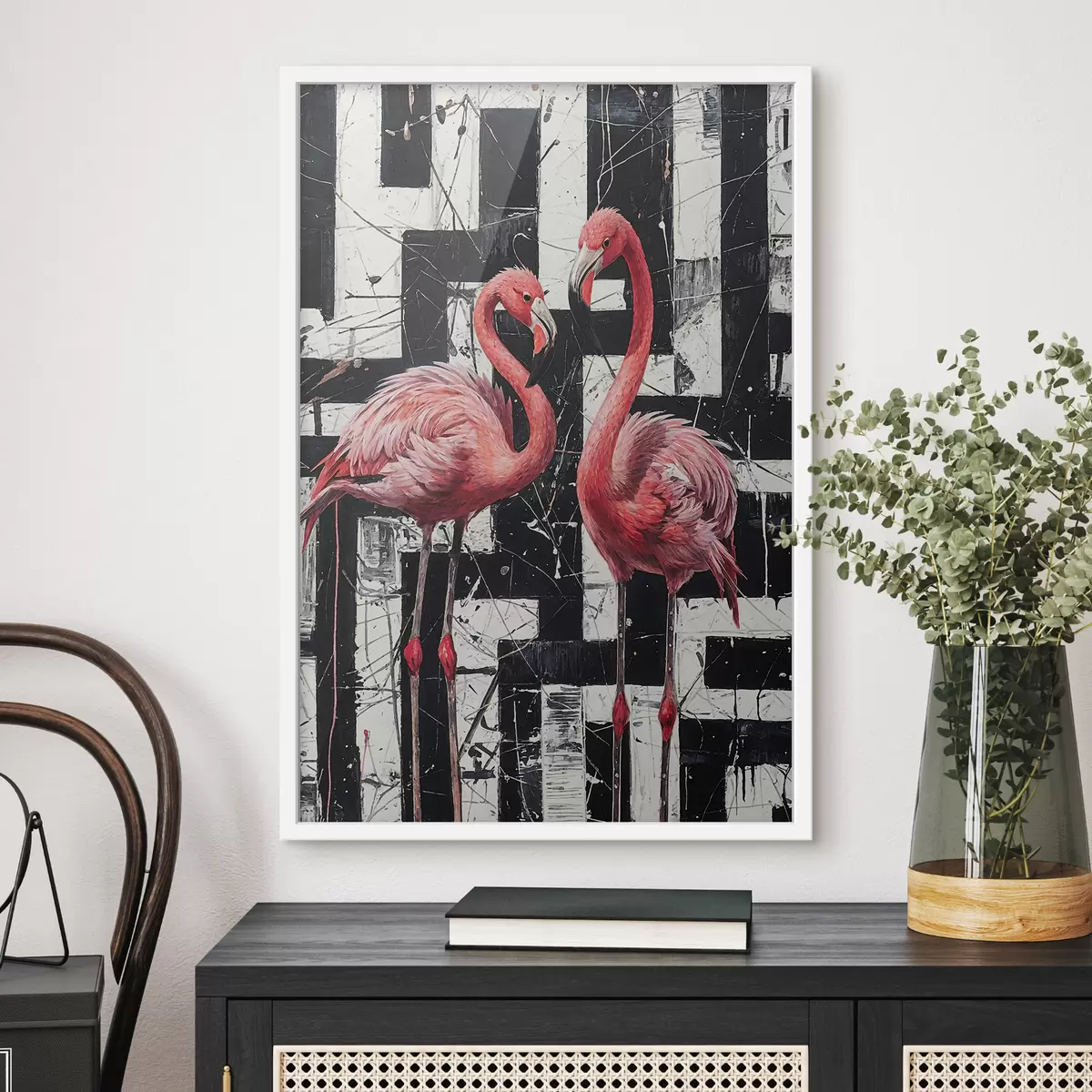 Plakatas Du rožiniai flamingai stovi prieš juodai baltą abstrakčių fono paveikslą Ne f38954