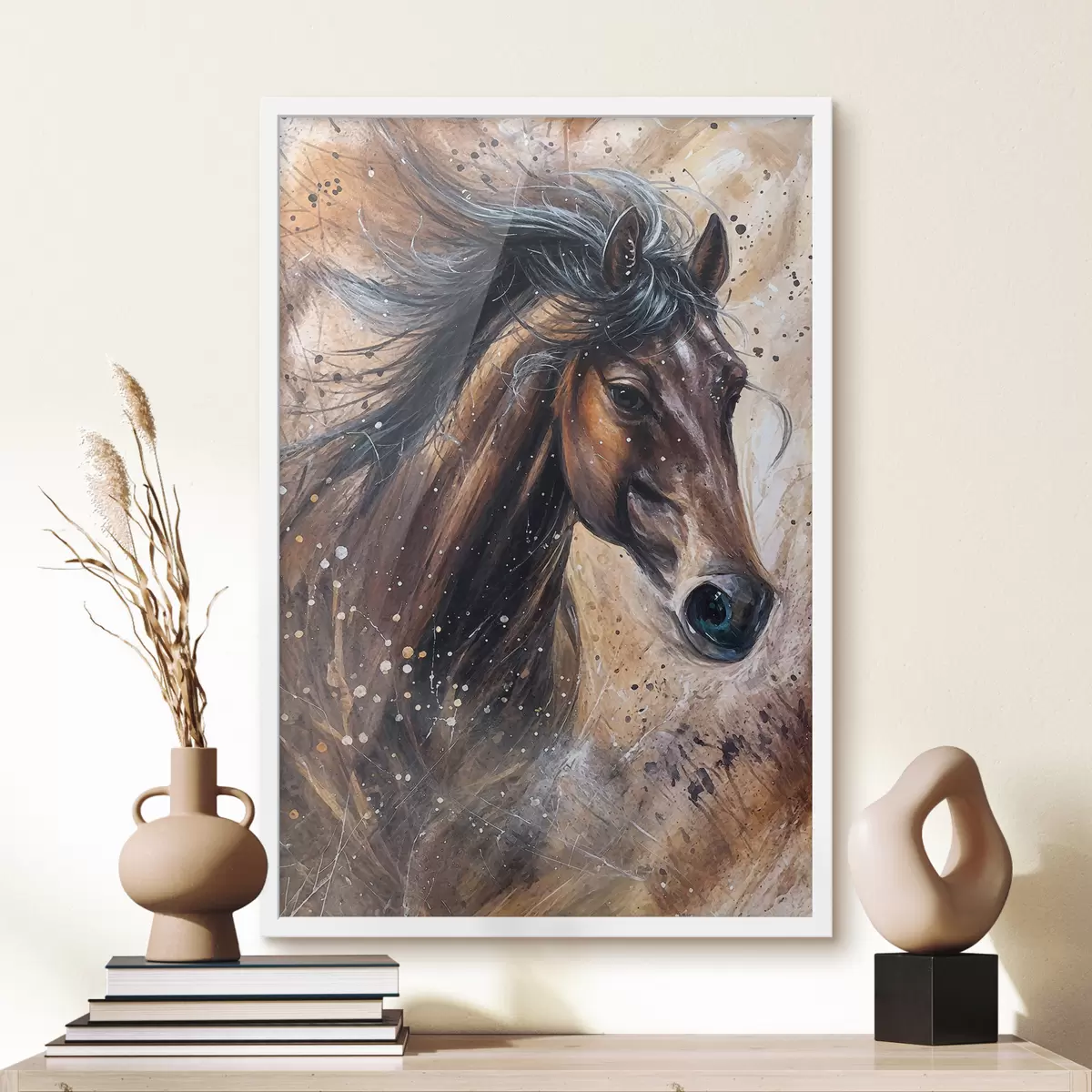 Plakatas Rudo arklio paveikslas su slenkančiais karčiais tekstūriniame fone su spalvų dvelksmais Ne f38959