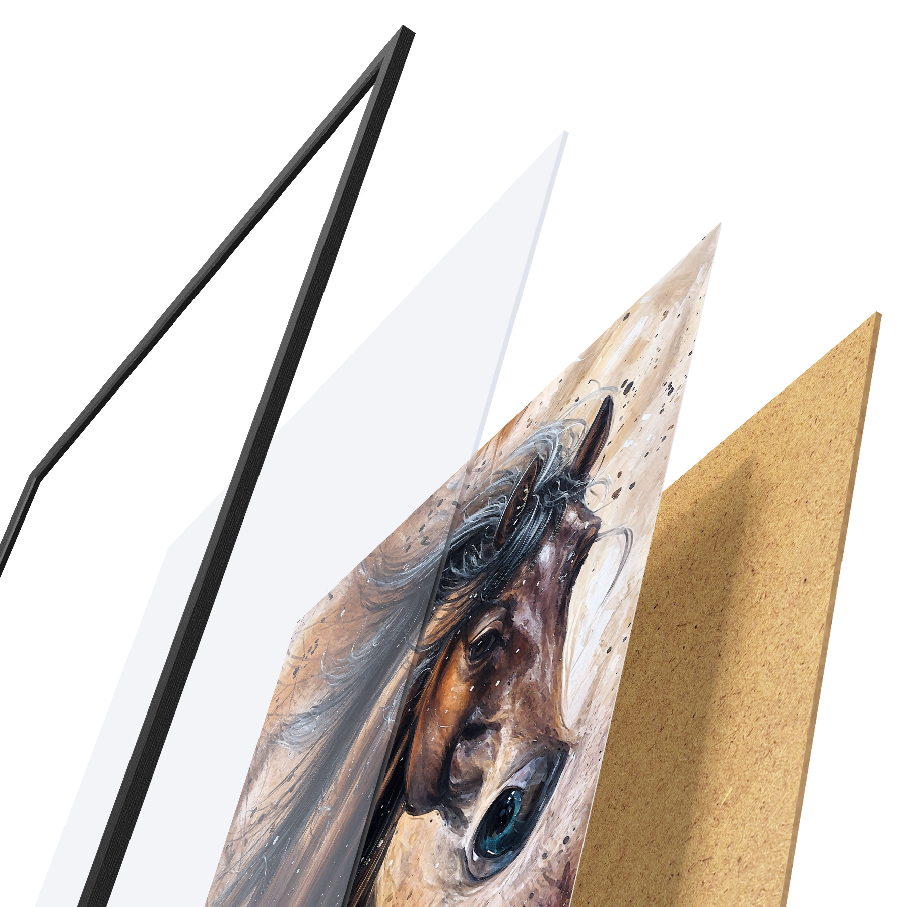 Plakatas Rudo arklio paveikslas su slenkančiais karčiais tekstūriniame fone su spalvų dvelksmais f38959