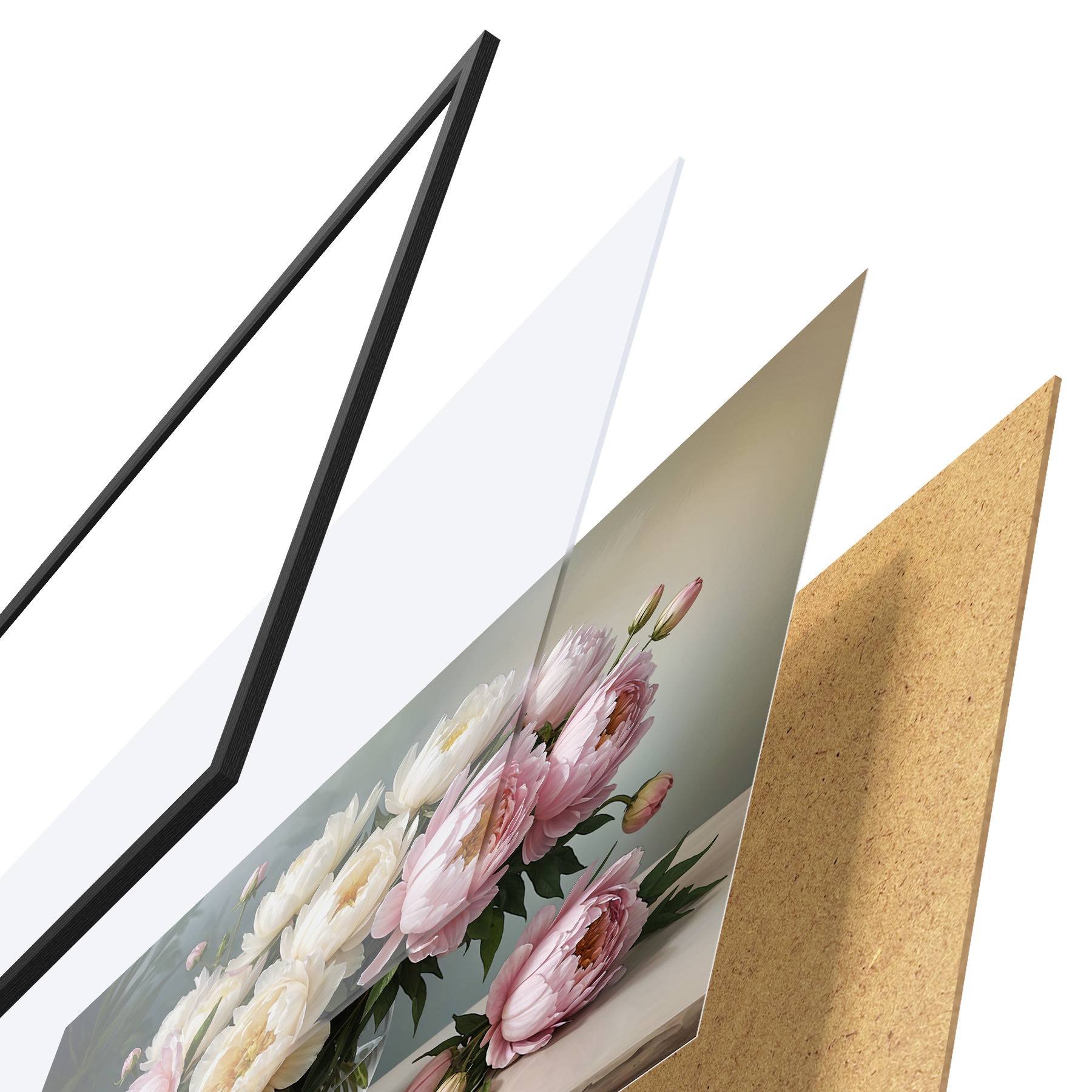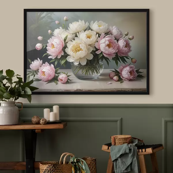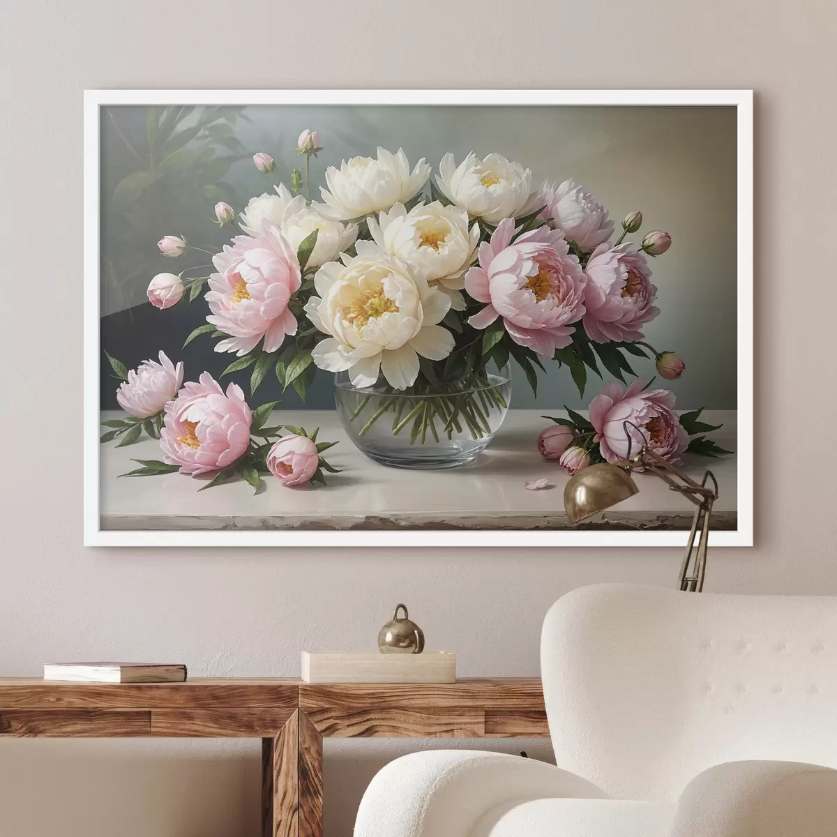 Plakatas Gražių baltų ir rožinių bijūnų puokštės paveikslas stiklinėje vazoje ant medinio stalo Ne f38967
