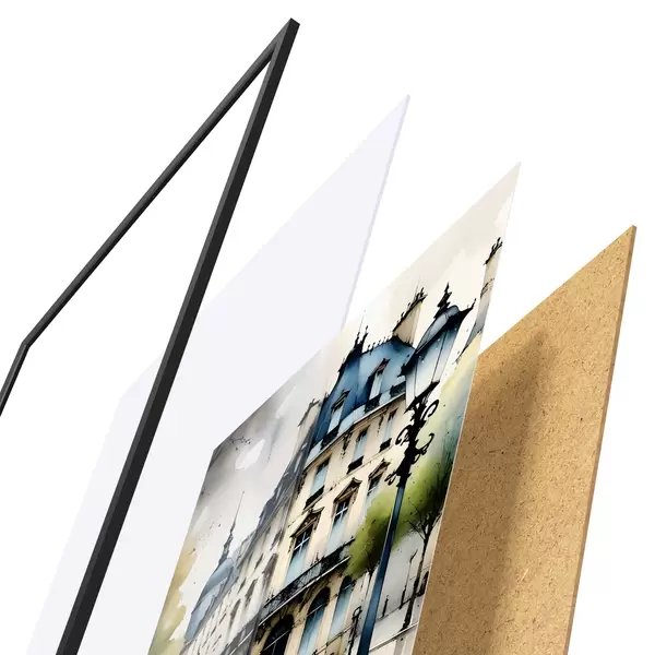 Plakatą sudaro rėmas, pleksiklas, atspausdintas vaizdas ir medžio drožlių plokštės pagrindas. Plakatą galima iš karto pakabinti ant sienos dėl kitoje pusėje esančių laikiklių.