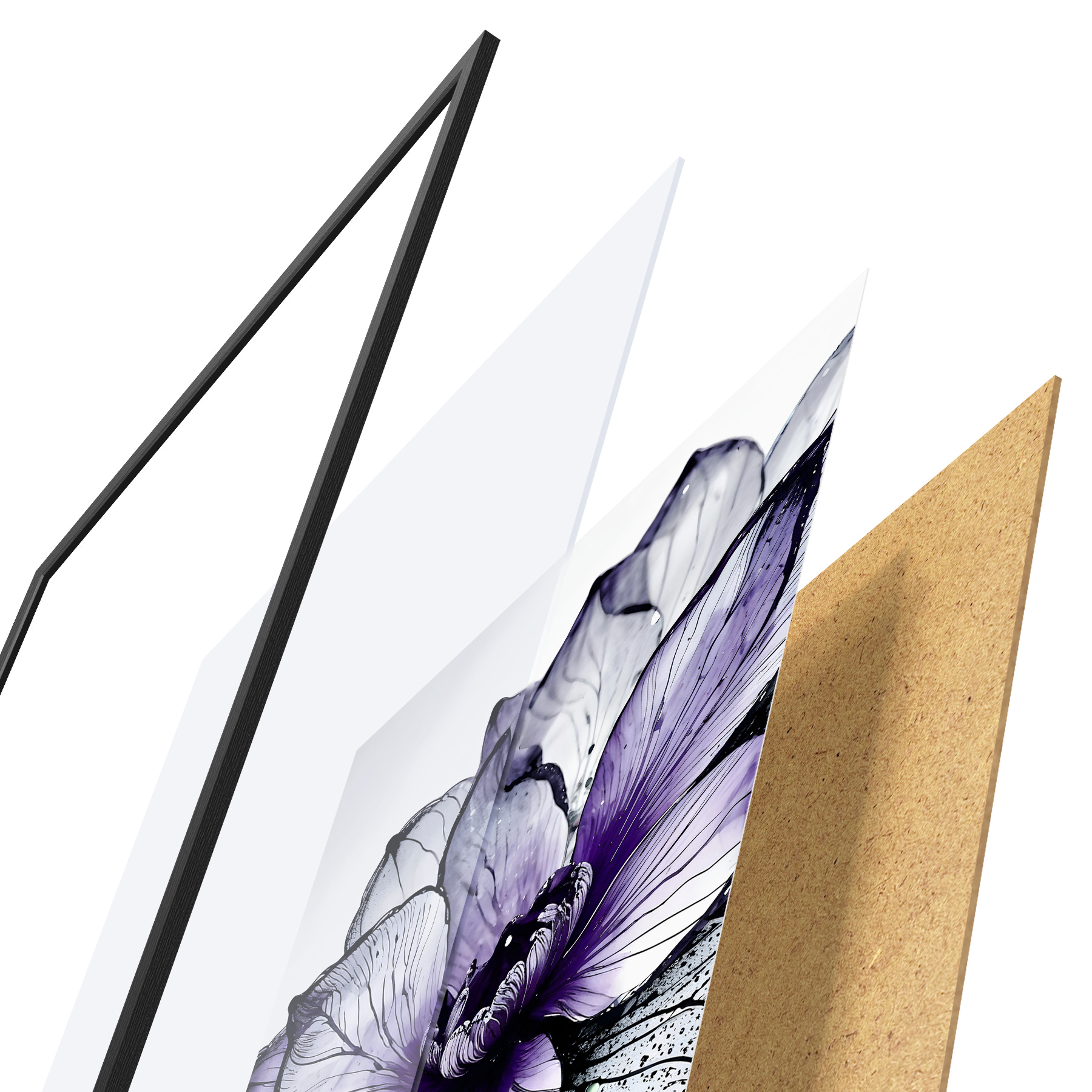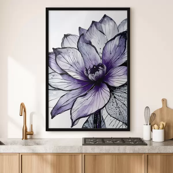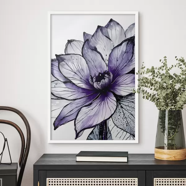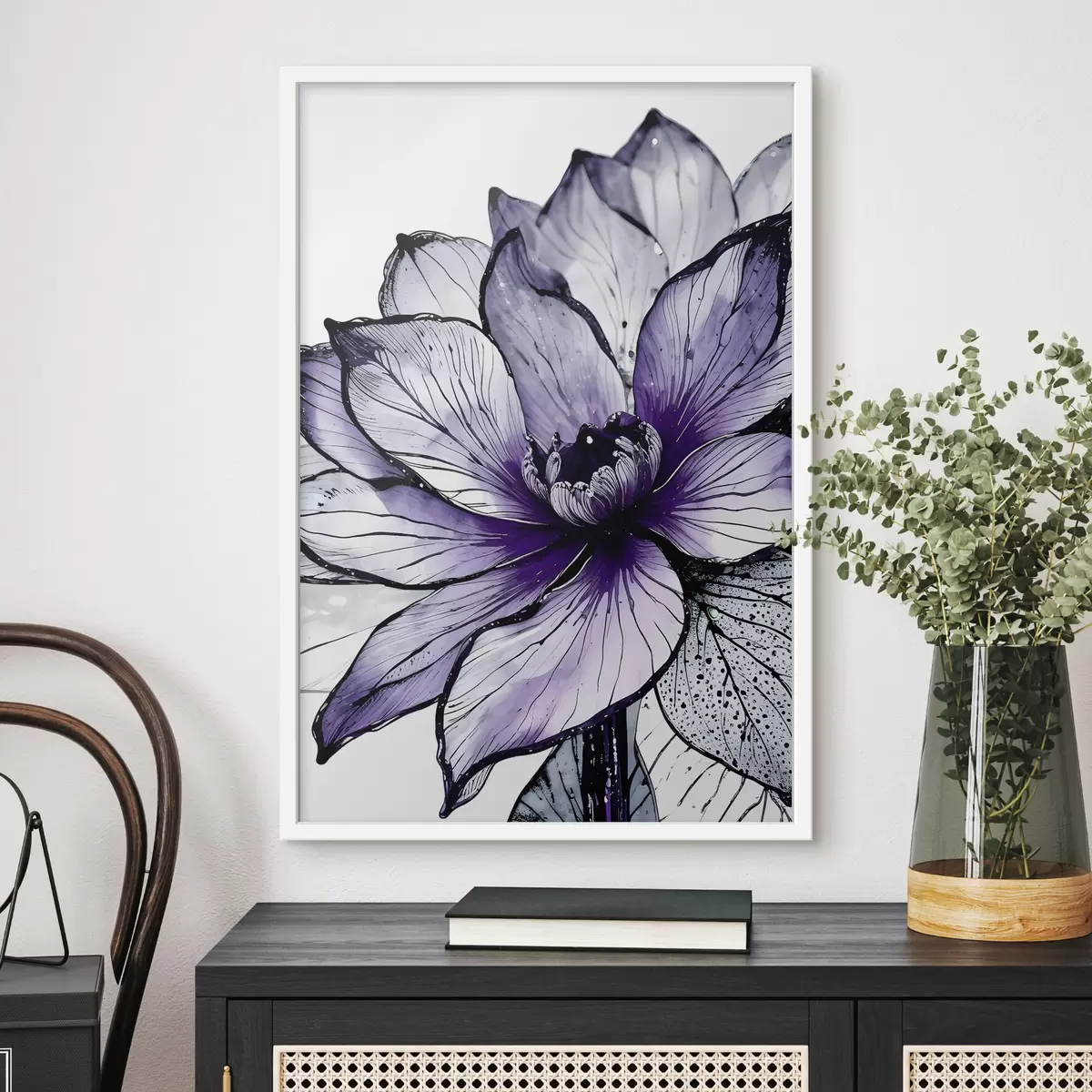 Plakatas Didelė, ryški violetinė gėlė su subtiliais, įmantriais žiedlapiais tamsiame fone f38982