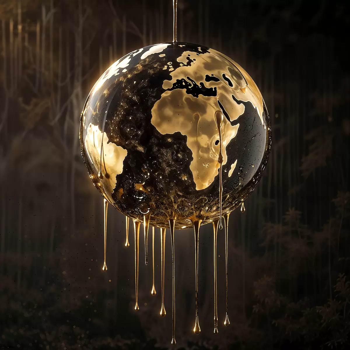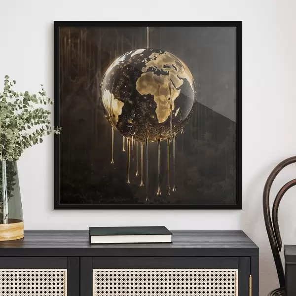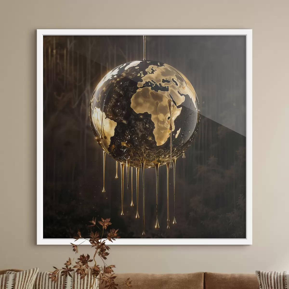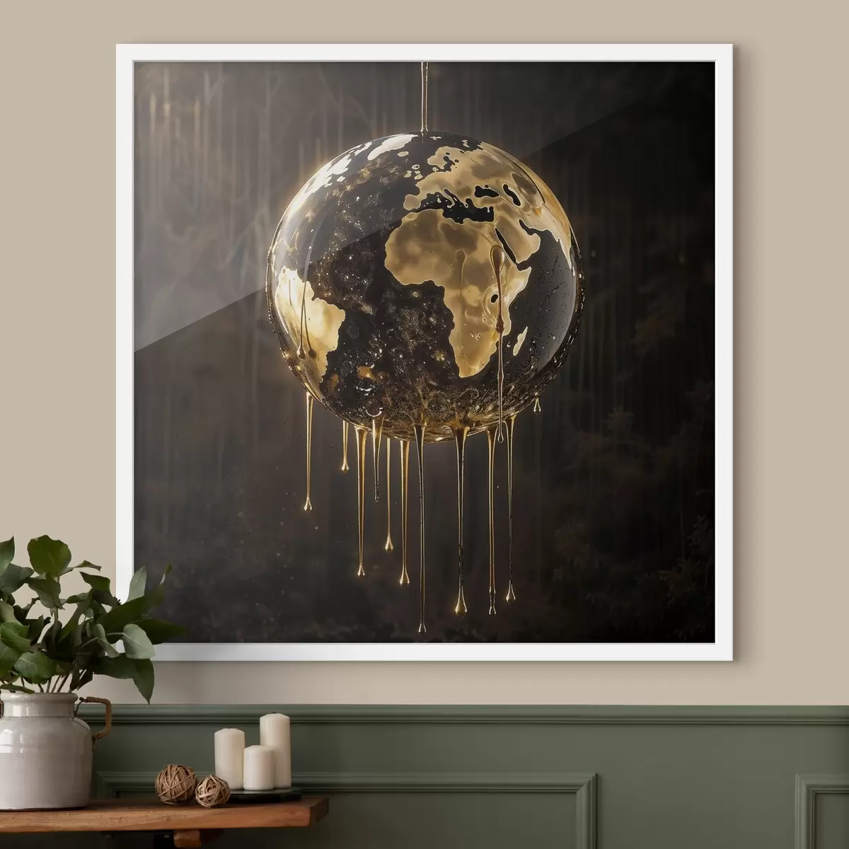 Plakatas Švytintis rutulys, vaizduojantis Žemę, apsuptą lašančio skysčio tamsiame fone f38983