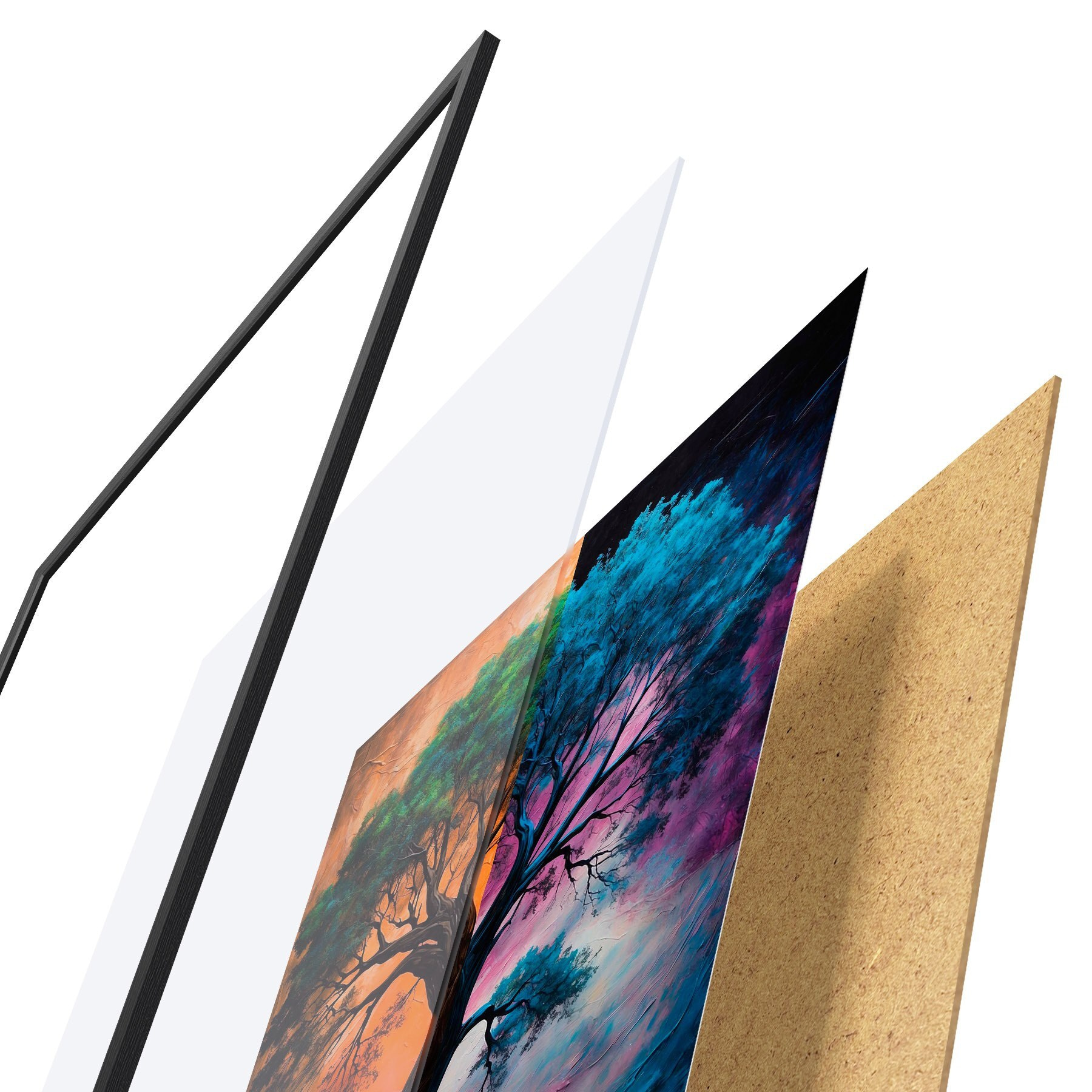 Plakatą sudaro rėmas, pleksiklas, atspausdintas vaizdas ir medžio drožlių plokštės pagrindas. Plakatą galima iš karto pakabinti ant sienos dėl kitoje pusėje esančių laikiklių.