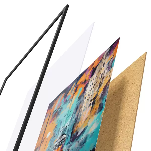 Plakatą sudaro rėmas, pleksiklas, atspausdintas vaizdas ir medžio drožlių plokštės pagrindas. Plakatą galima iš karto pakabinti ant sienos dėl kitoje pusėje esančių laikiklių.