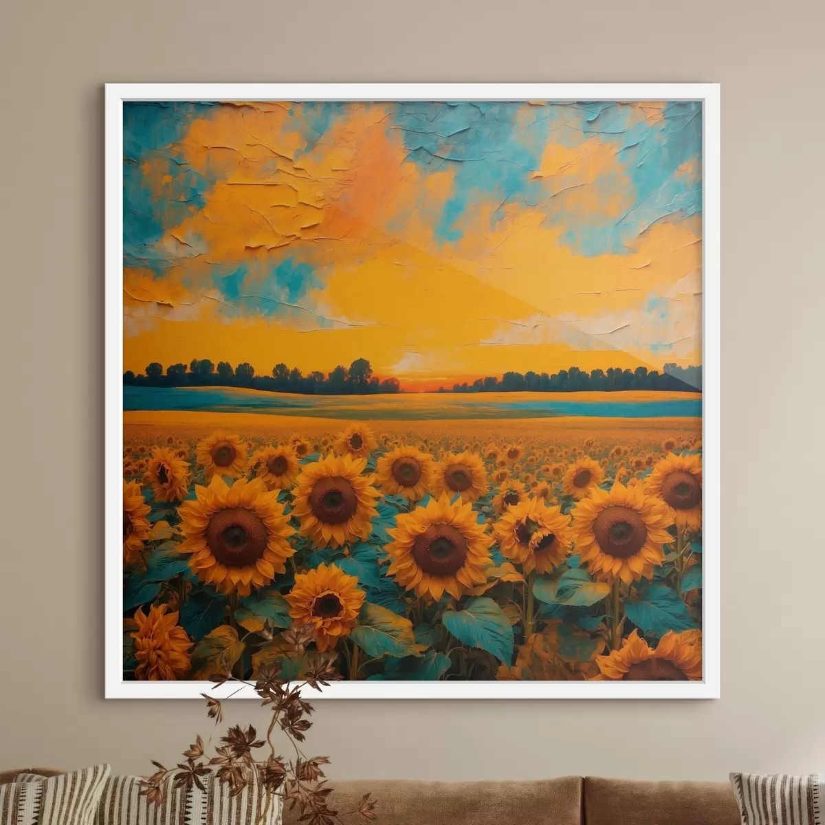 Plakatas Ryškios saulėgrąžos pasitinka saulėlydžio dangų f39008