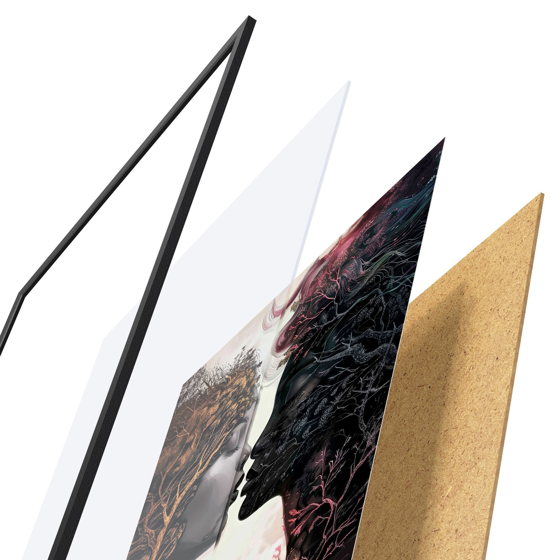 Plakatą sudaro rėmas, pleksiklas, atspausdintas vaizdas ir medžio drožlių plokštės pagrindas. Plakatą galima iš karto pakabinti ant sienos dėl kitoje pusėje esančių laikiklių.