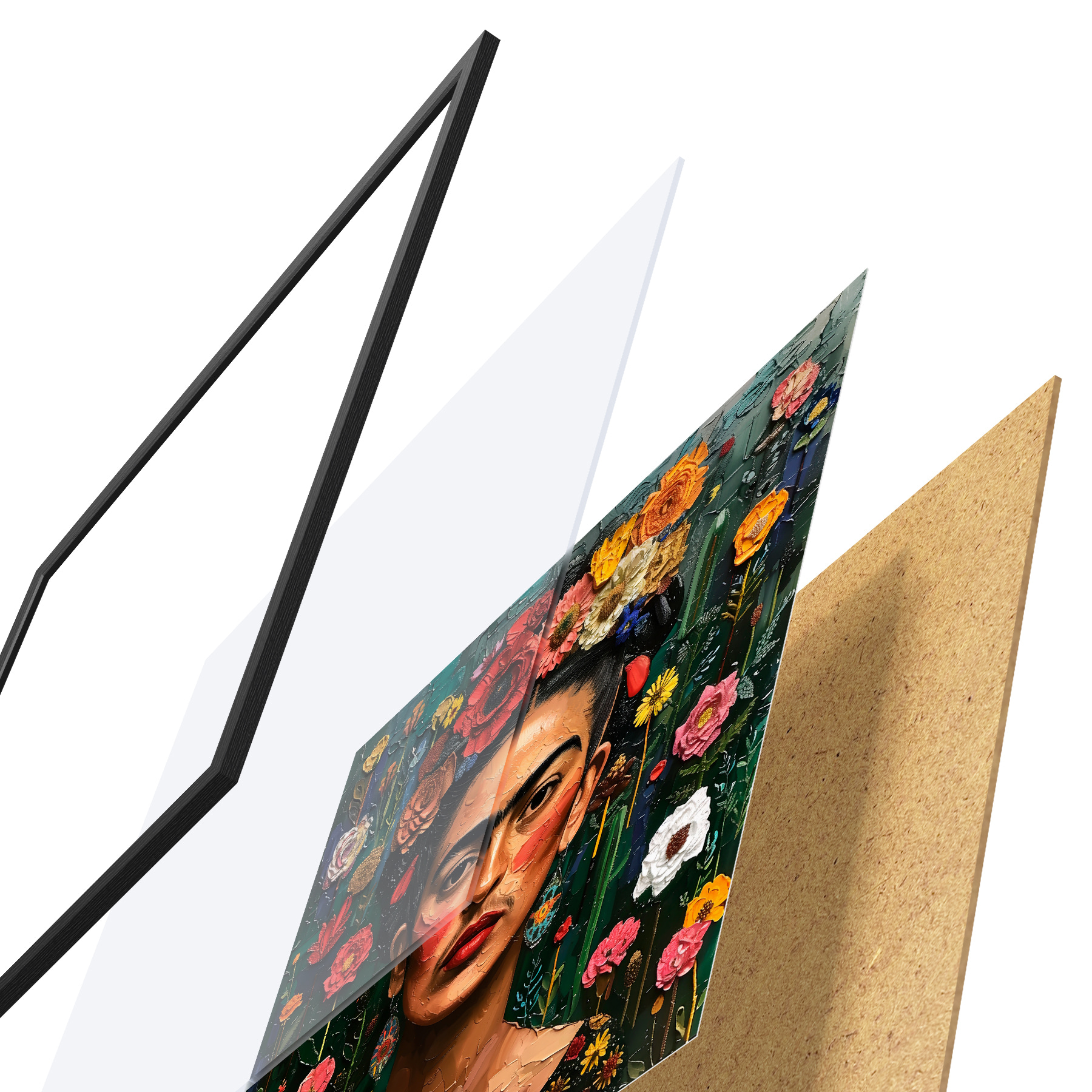 Plakatą sudaro rėmas, pleksiklas, atspausdintas vaizdas ir medžio drožlių plokštės pagrindas. Plakatą galima iš karto pakabinti ant sienos dėl kitoje pusėje esančių laikiklių.